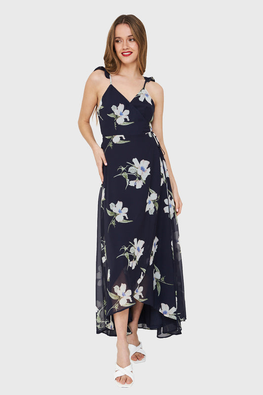 Vestido Largo Flores Envolvente Azul