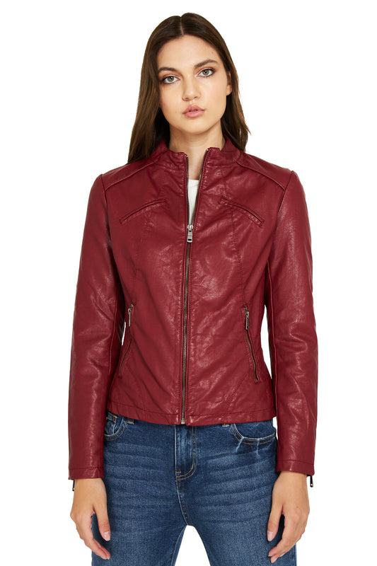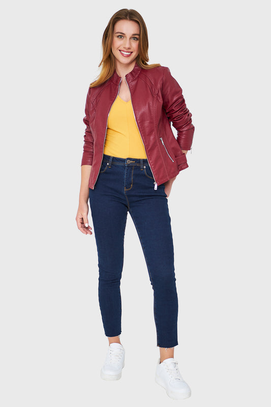 Chaqueta Ecocuero Cuello Mao Burdeo