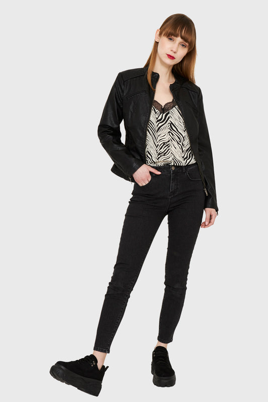 Chaqueta Cuello Mao Ecocuero Cierre Diagonal Negro