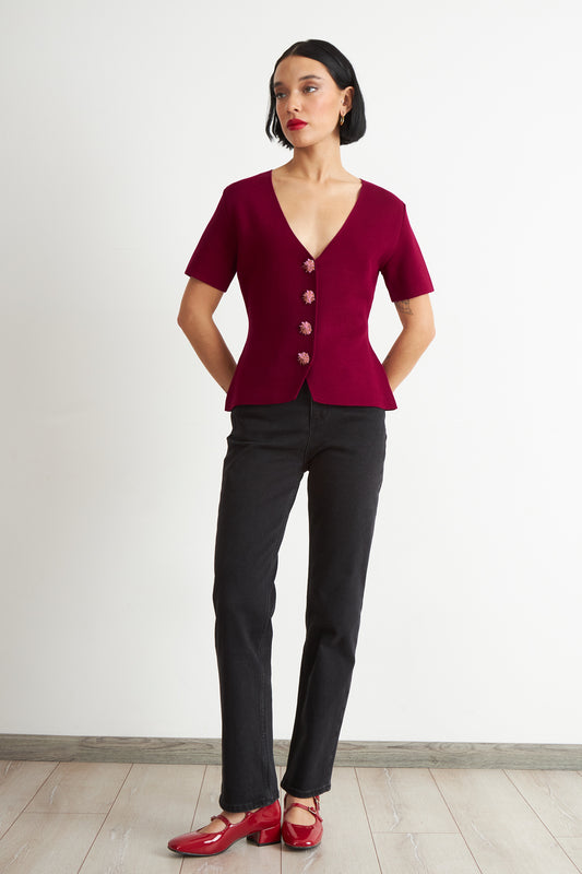 • Polera Hilo Cuello V Botones Burdeo