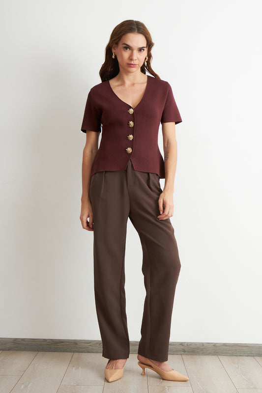 Polera Hilo Cuello V Botones Café