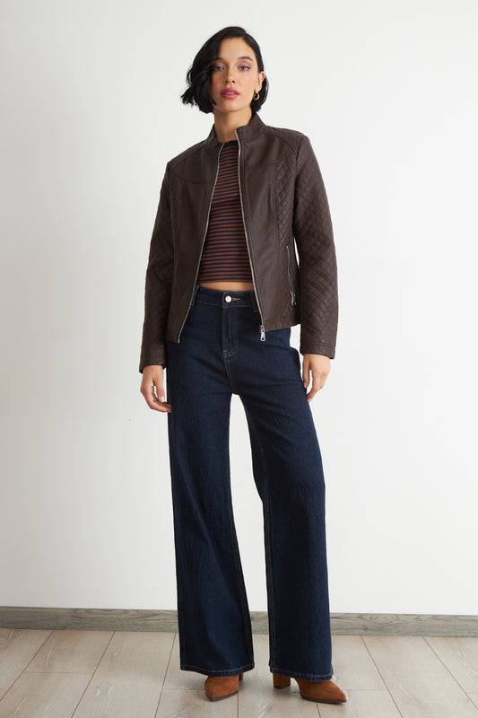 Chaqueta Ecocuero Acolchado Cuello Mao Café