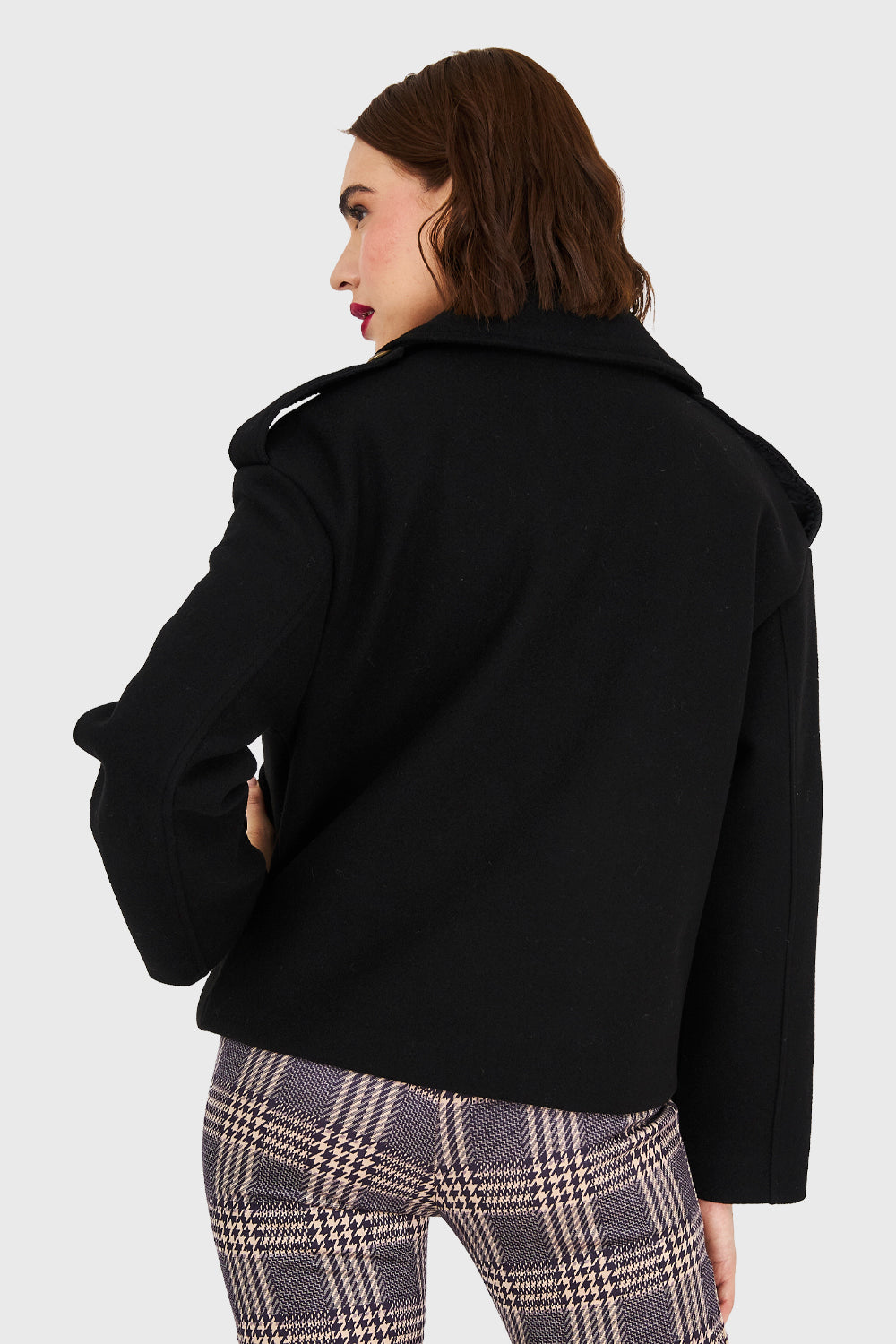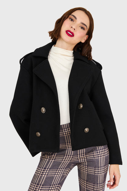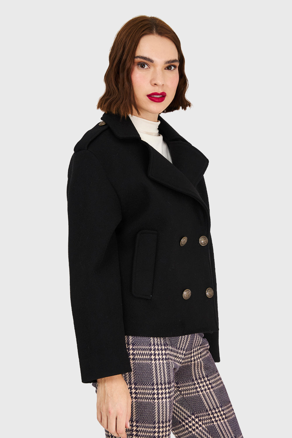 Características: Abrigo corto escote cruzado. Detalle de divisas en hombros. Botón interior y 2 botones de ajuste exteriores. Bolsillos funcionales. Posee forro.