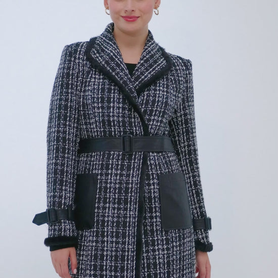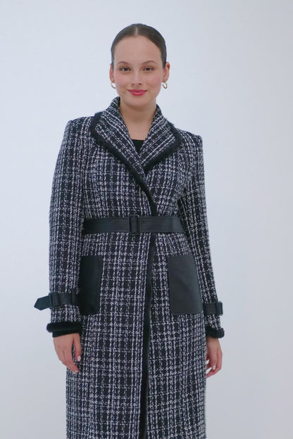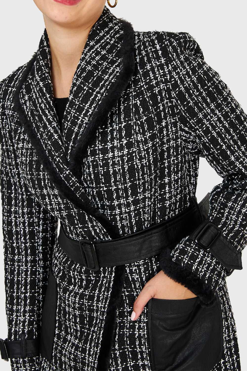 Características: Abrigo tejido cuadrille. 2 broches invisibles al interior para su ajuste. Lazo bolsillos y detalles de puños de ecocuero. Posee hombreras y forro. Lazo con terminación de hebilla.