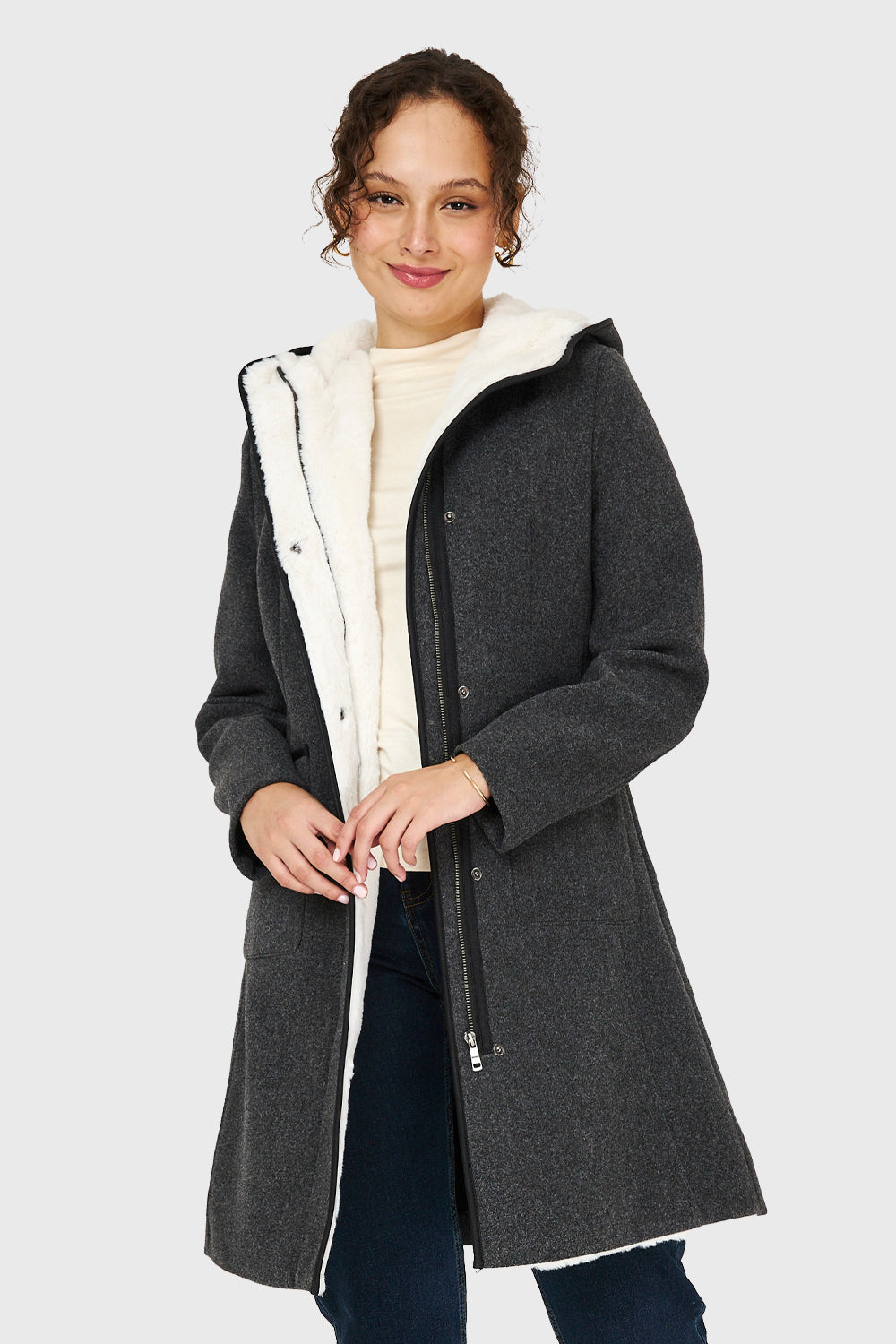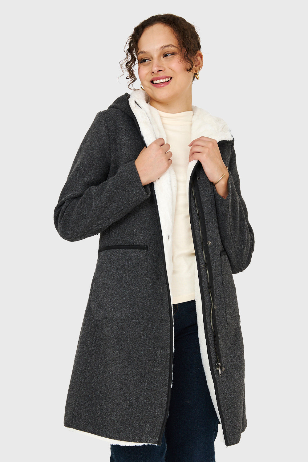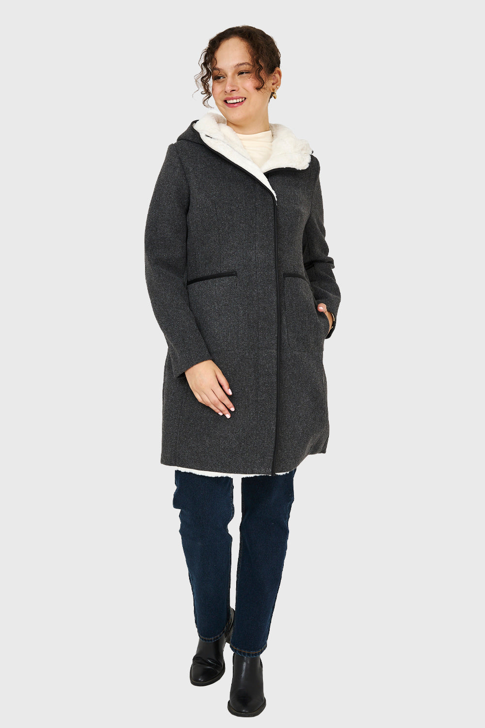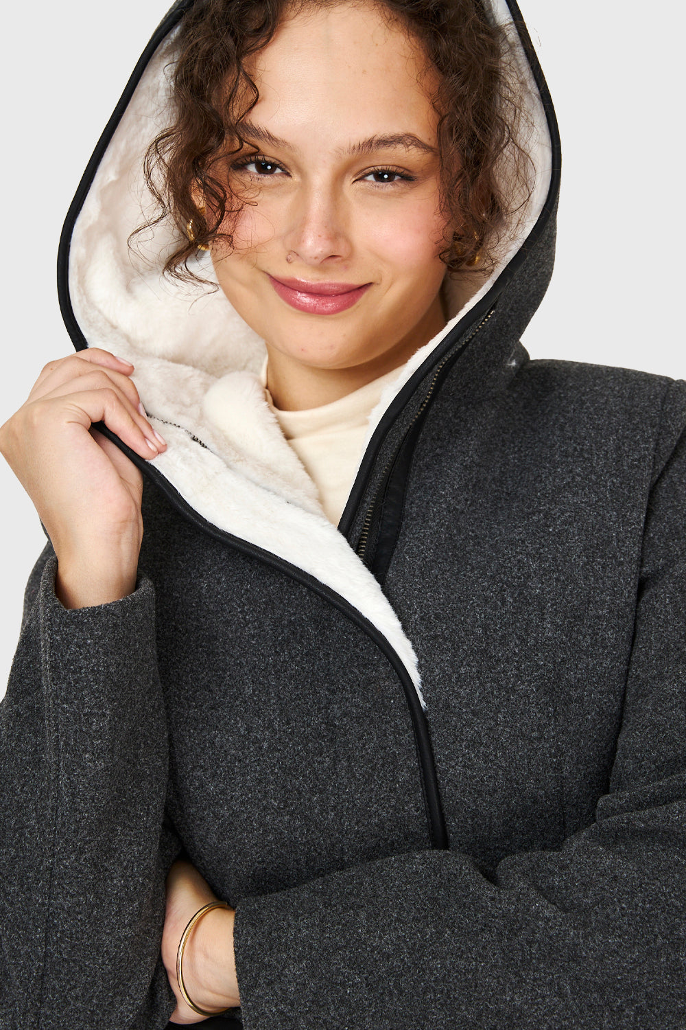 Características: Abrigo forro tipo piel. Bolsillos invisibles al costado. Cierre y broches de ajustes. Gorro forrado con tejido tipo piel.