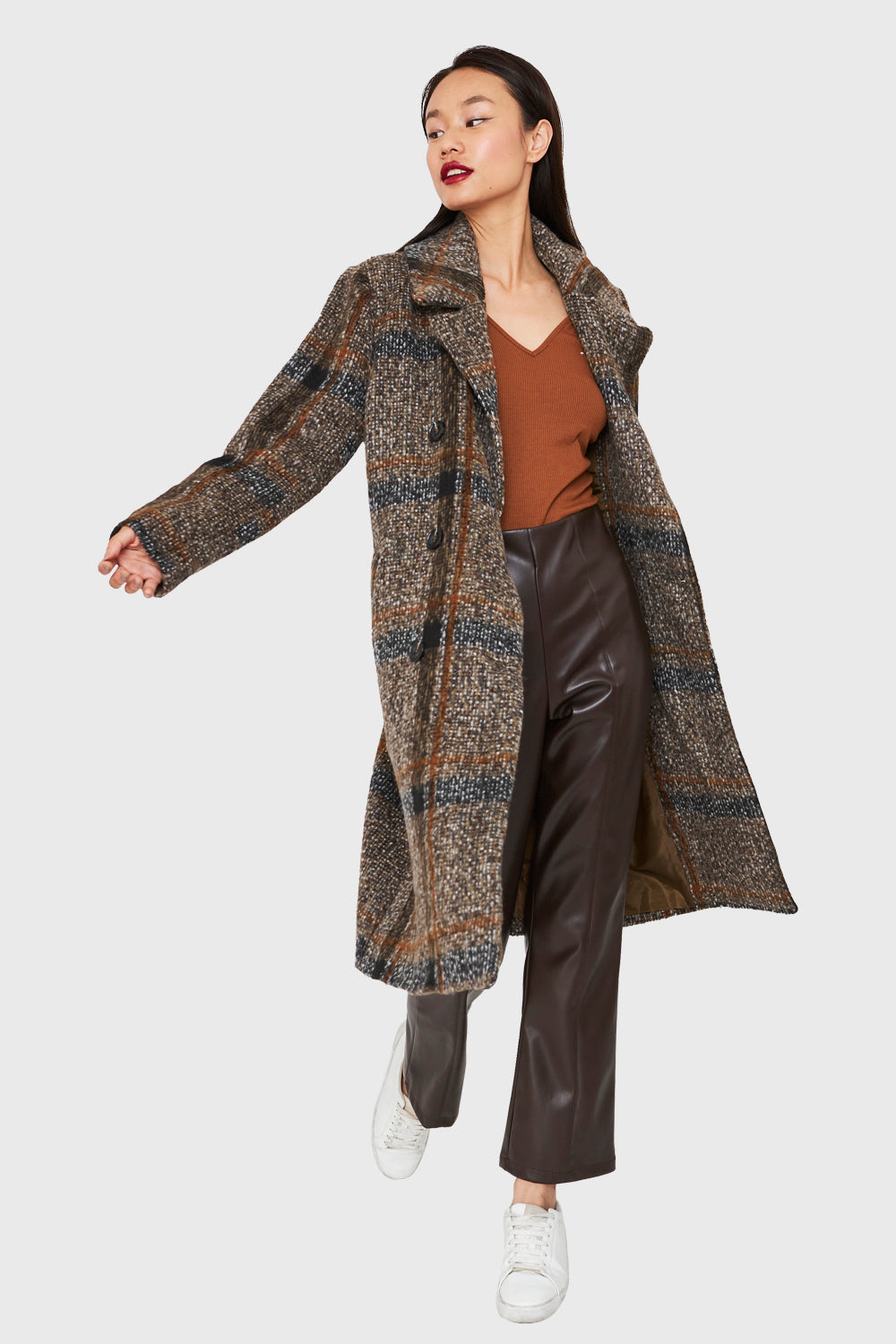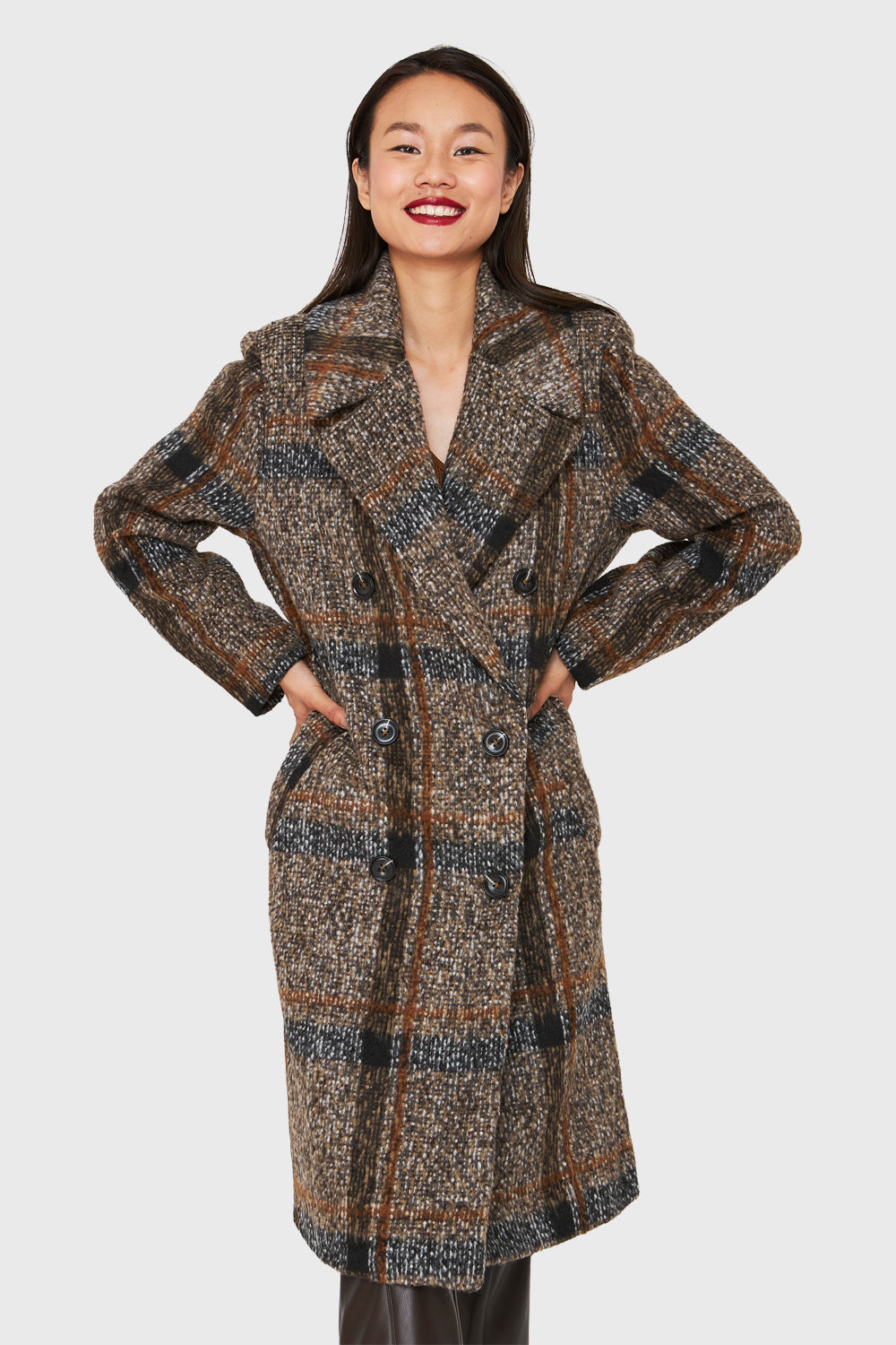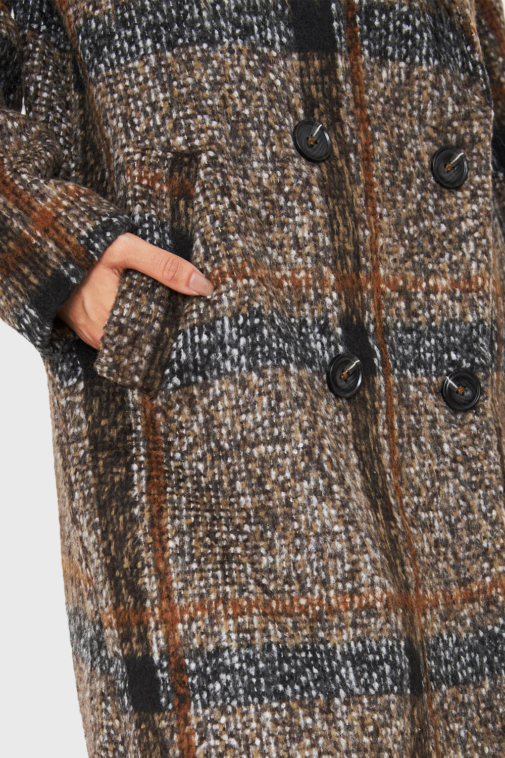 Características: Abrigo largo tartán holgado con 6 botones. Posee bolsillos laterales, hombreras y tajo en la parte baja posterior.