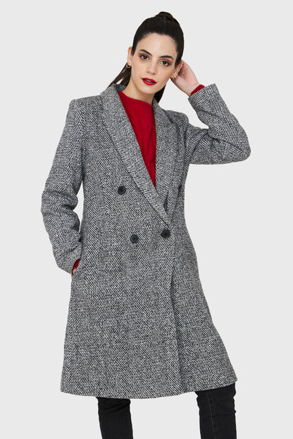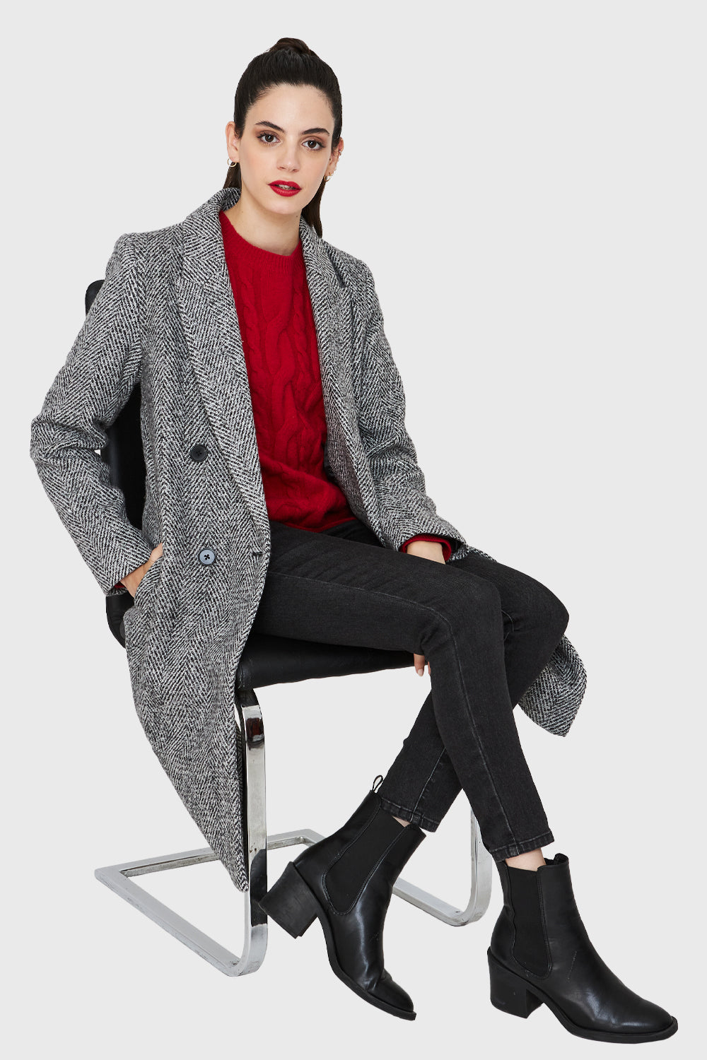 Características: Abrigo jaspeado 4 botones con bolsillos laterales y forro. Posee hombreras y tajo en la parte posterior.