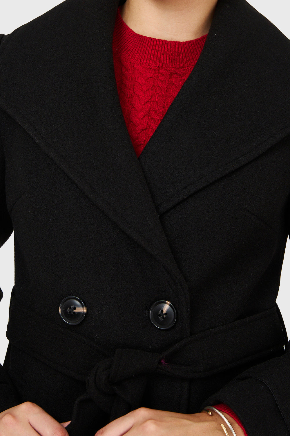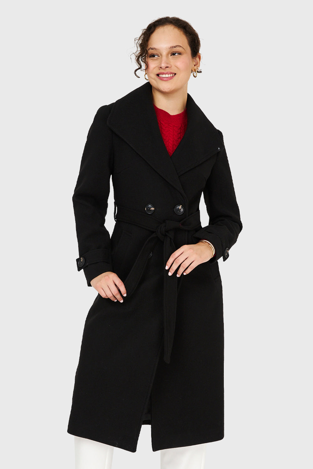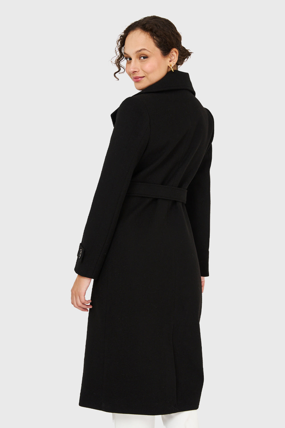 Características: Abrigo solapa cruzada con lazo de ajuste y hombreras. Botón interior y 2 botones externos de ajuste. Bolsillos al costado y tajo posterior en la basta. Posee forro.