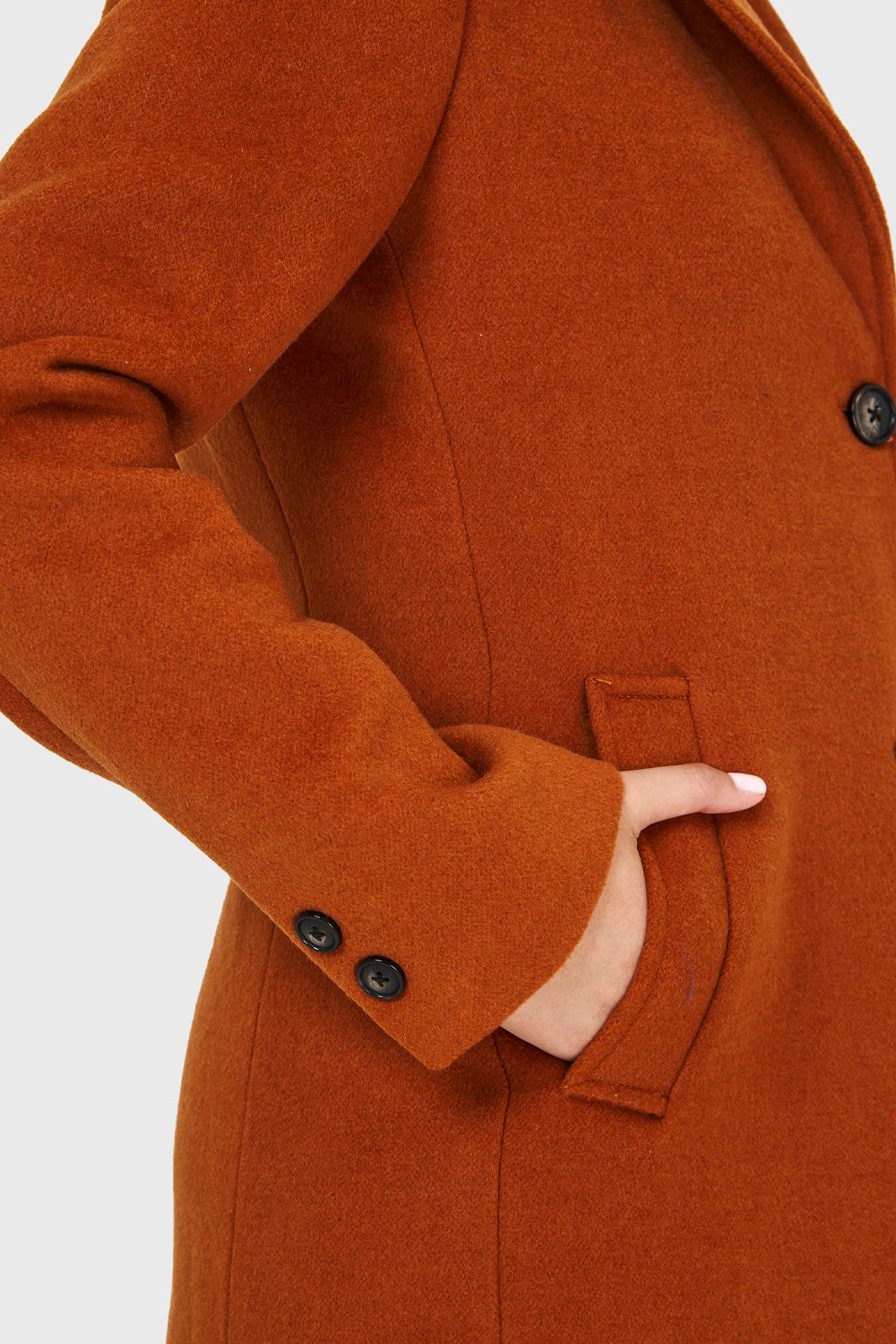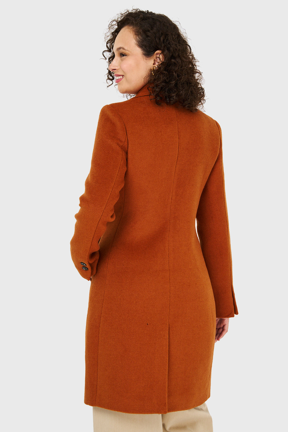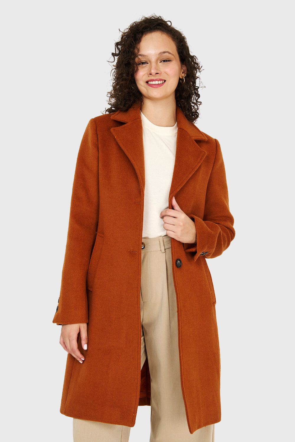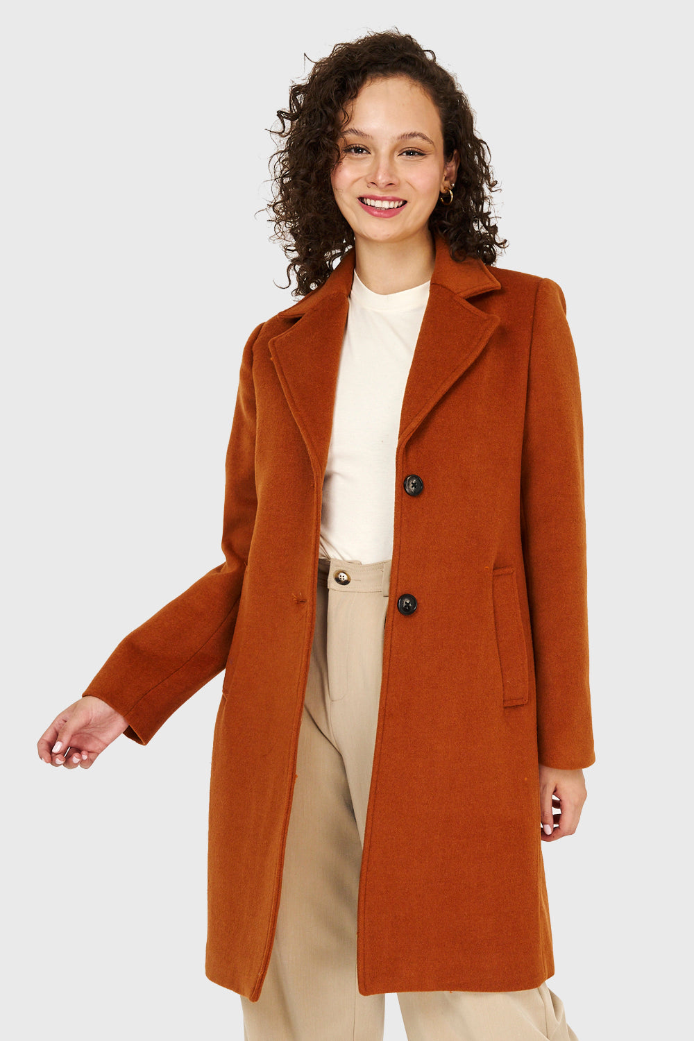 Tipo de cuello: V Características: Abrigo textura tipo paño con dos botones de ajuste y bolsillos laterales funcionales. Posee hombreras, es forrado y abertura en la parte baja.