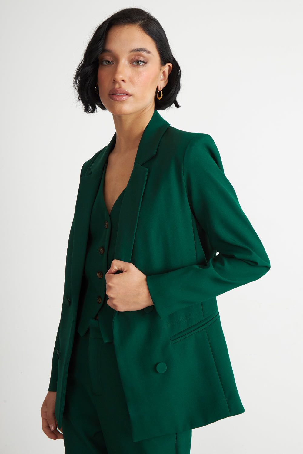 Características: Blazer largo de cuello cruzado. Bolsillo decorativo en busto y bolsillos sastre funcionales. Solapa larga. Posee pinzas frontales y forro.