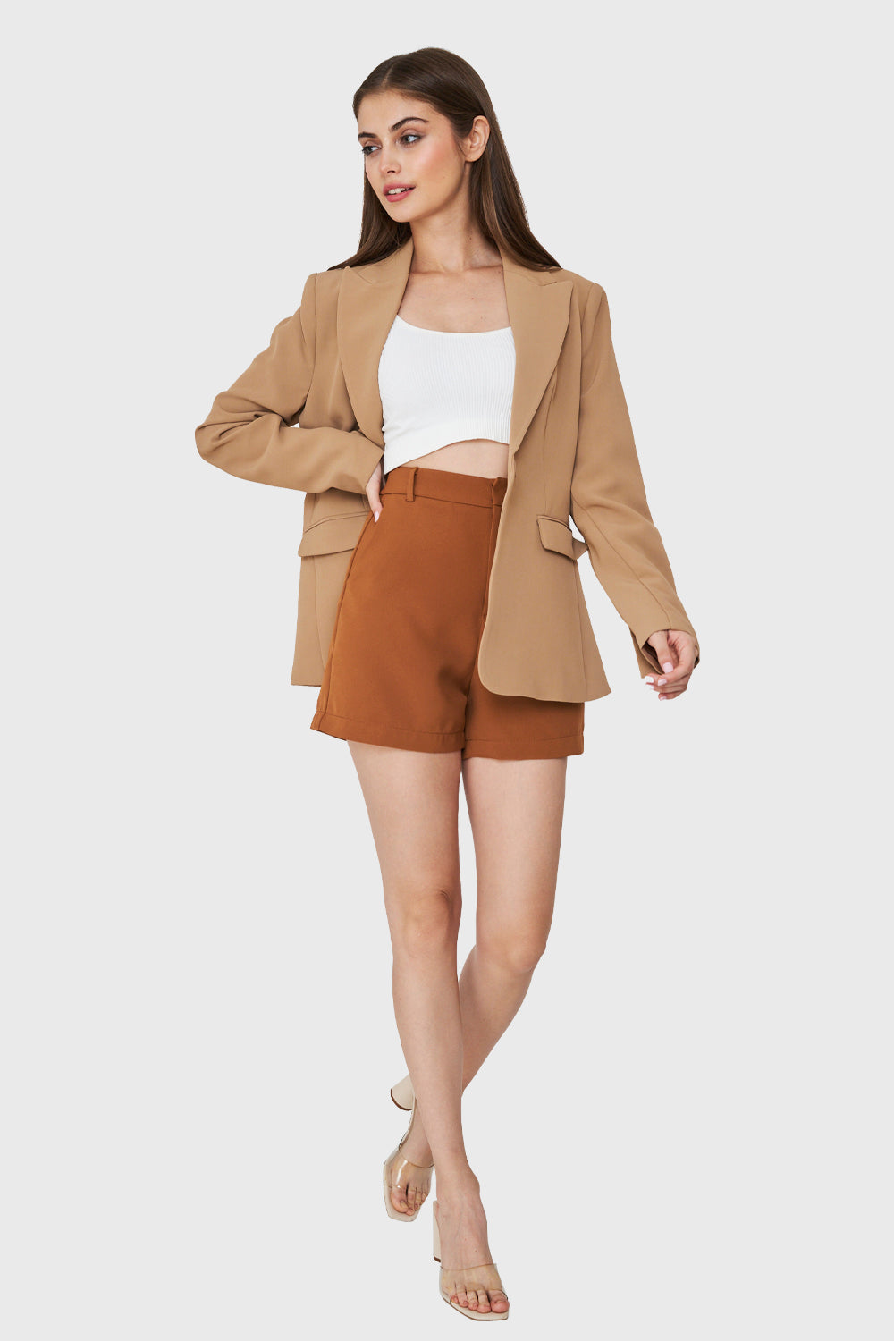 Características: Blazer bolsillos funcionales con solapas. Botón de ajuste, hombreras, tajo en la parte posterior y botones de ajuste en puños.