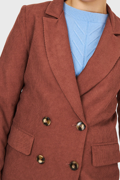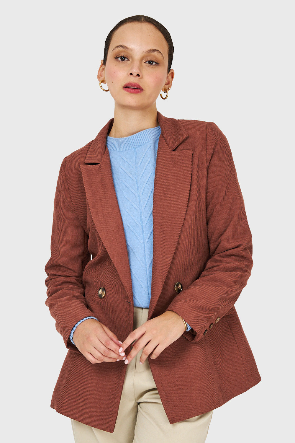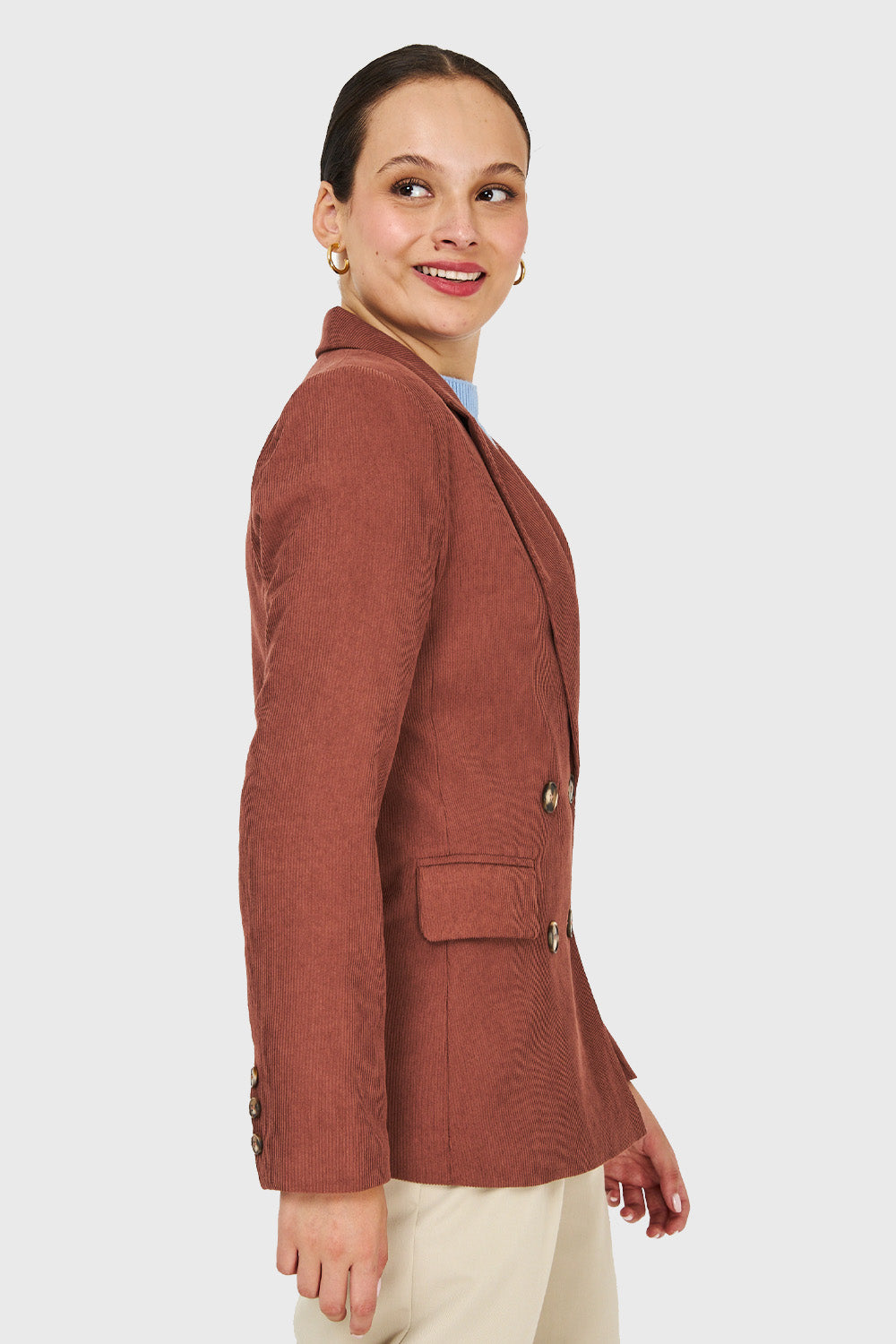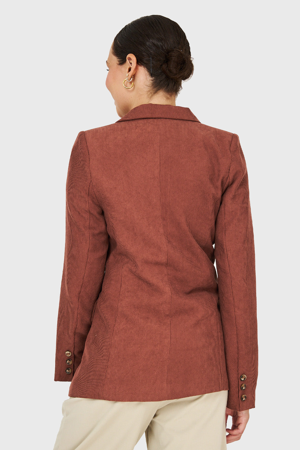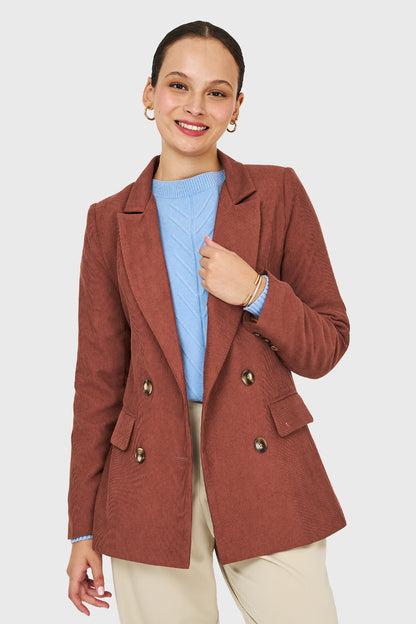 Características: Blazer solapa muesca con escote cruzado. Bolsillos con doble ribete y solapas. Botón interior y dos botones exteriores para su ajuste. Posee forro y hombreras.