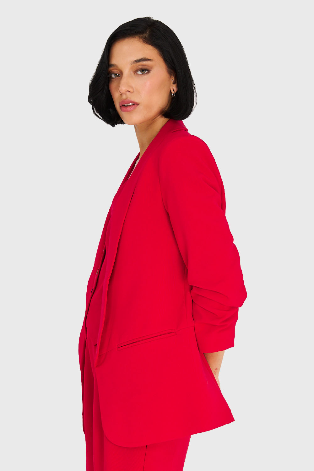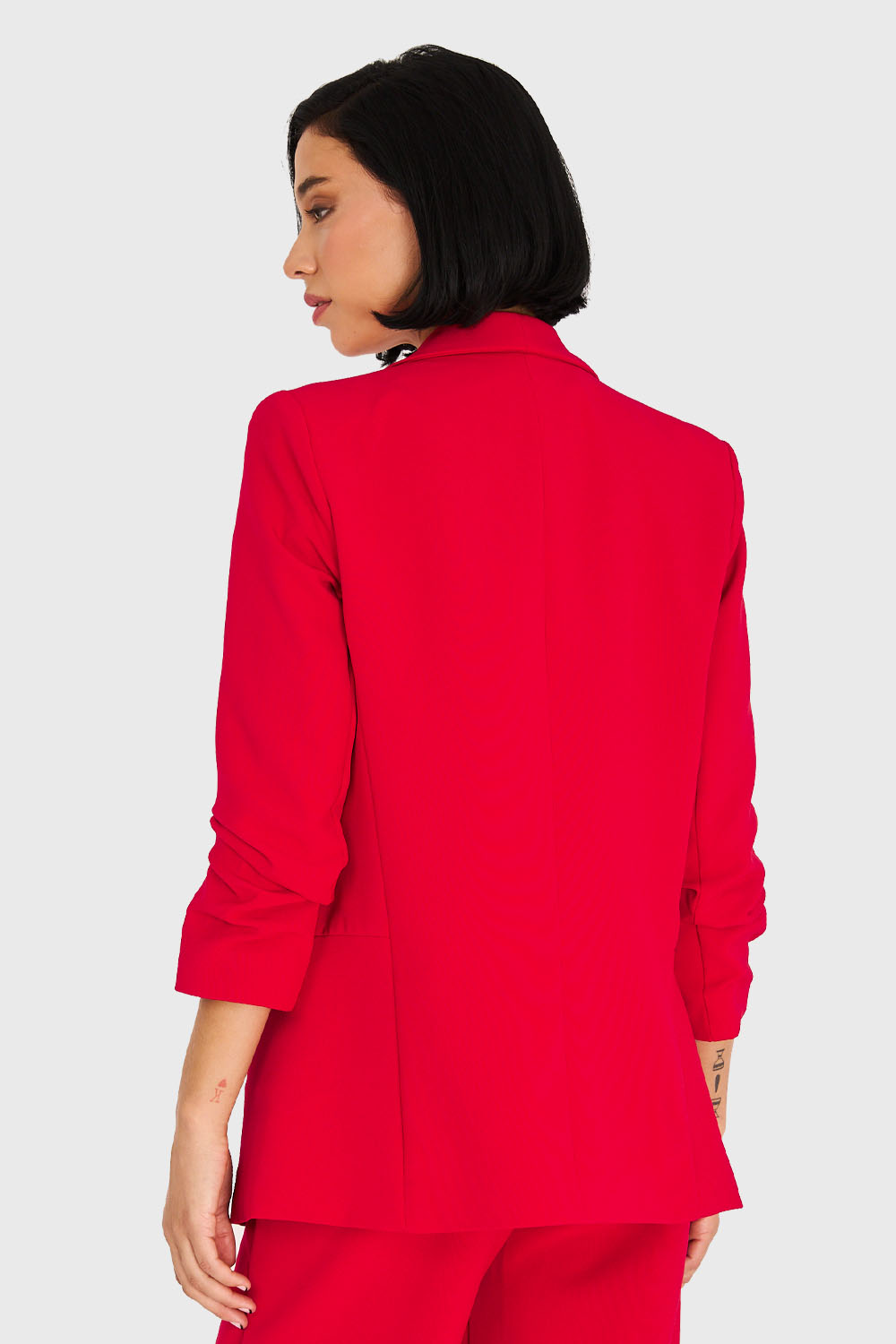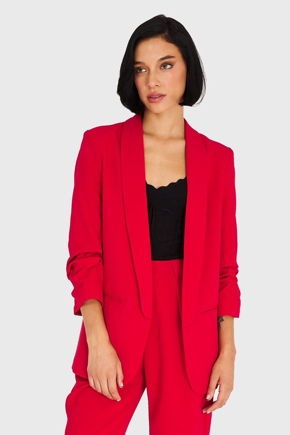 Características: Blazer de tope con solapa larga. Mangas 3/4 con pliegues. Posee forro y hombreras. Bolsillos laterales decorativos.