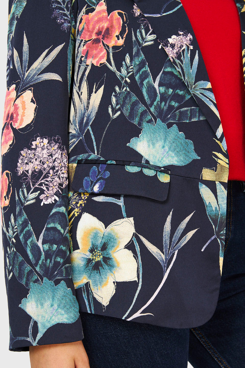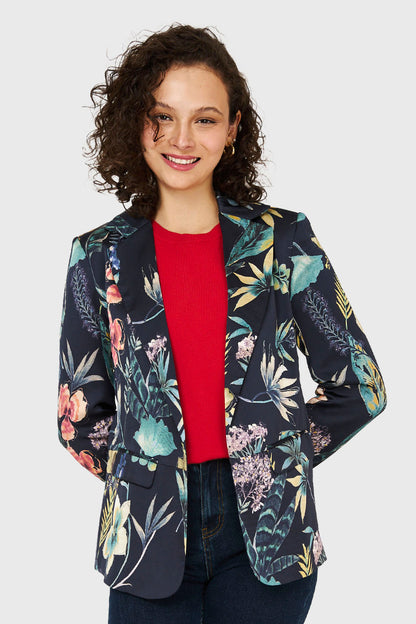 Características: Blazer de tope, solapa muesca con escote en V. Bolsillos falsos. Posee forro y hombreras. Estampado floral.