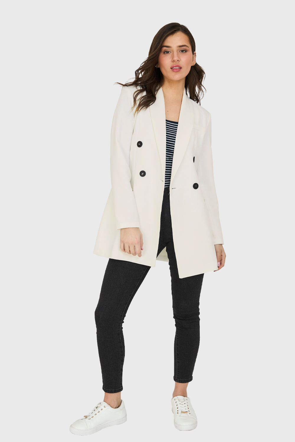 Características: Blazer largo cuatro botones. Detalle de bolsillo en busto y bolsillos funcionales laterales. Solapa larga. Posee pinzas frontales y forro. Es ceñido.