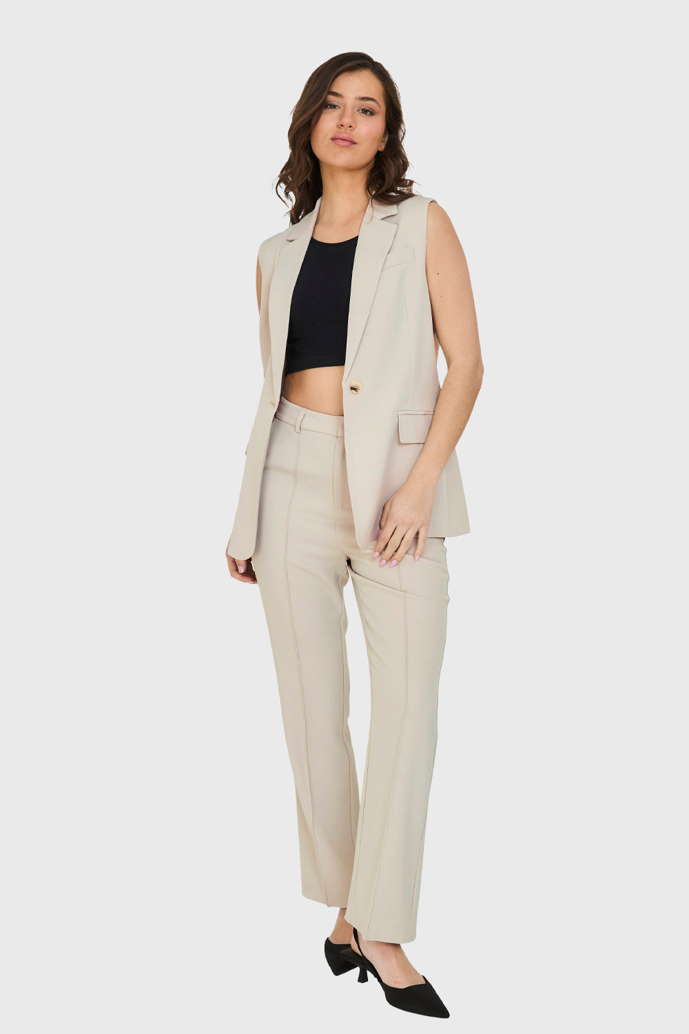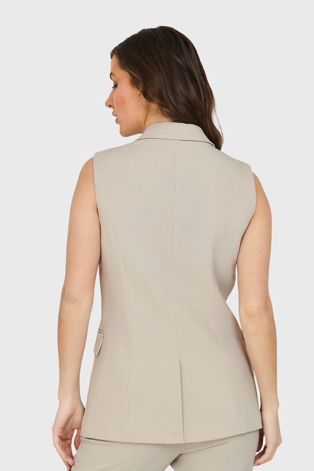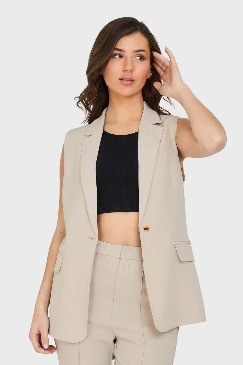 Características: Blazer sin mangas con botón de ajuste frontal. Tajo en la parte posterior y bolsillos laterales funcionales con solapa. Forrado.