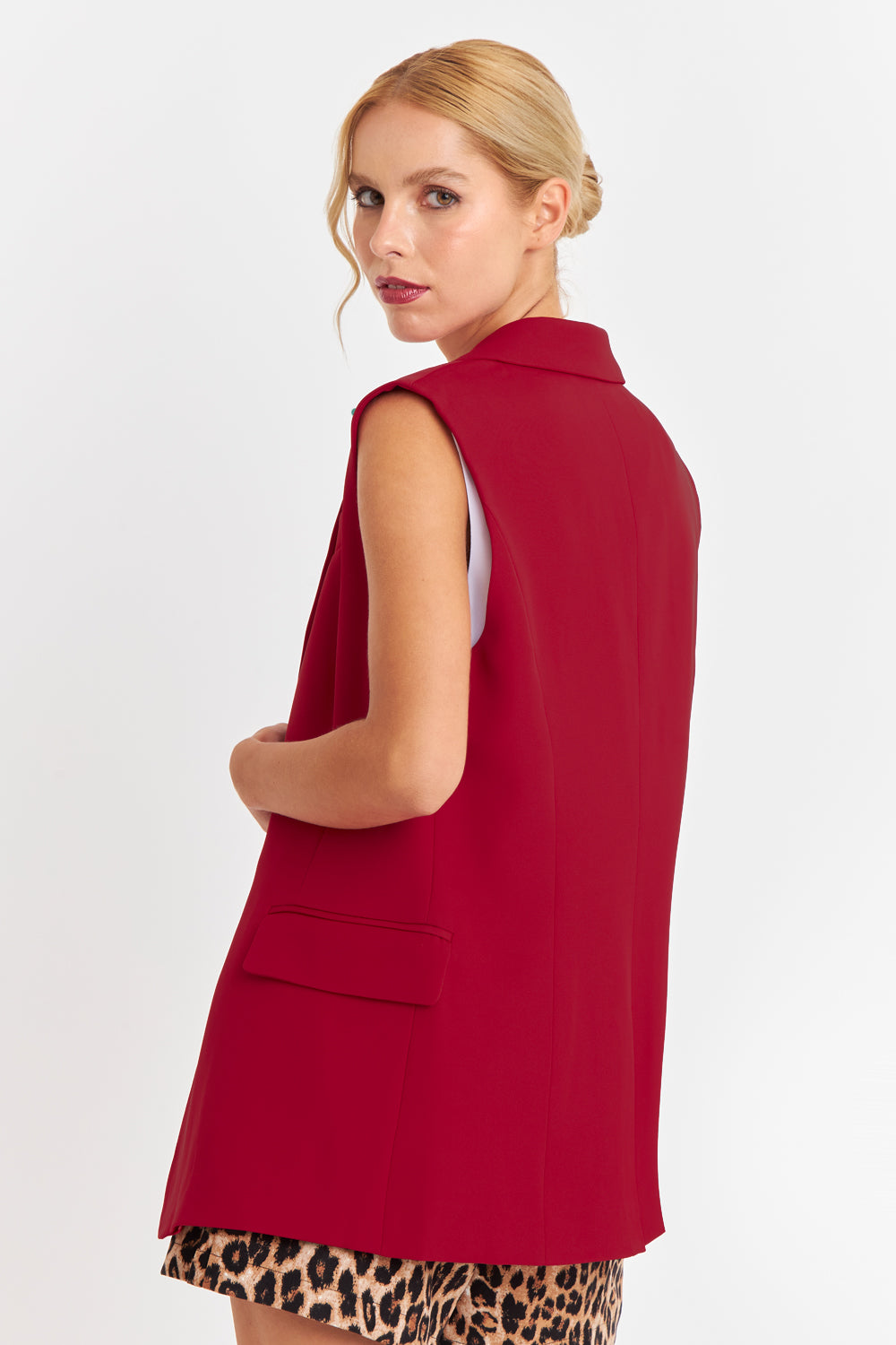 Características: Blazer sin mangas con botón de ajuste frontal. Tajo en la parte posterior y bolsillos laterales funcionales con solapa. Forrado.