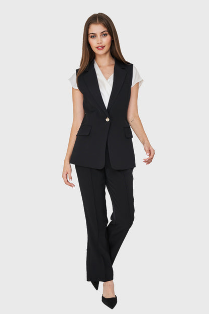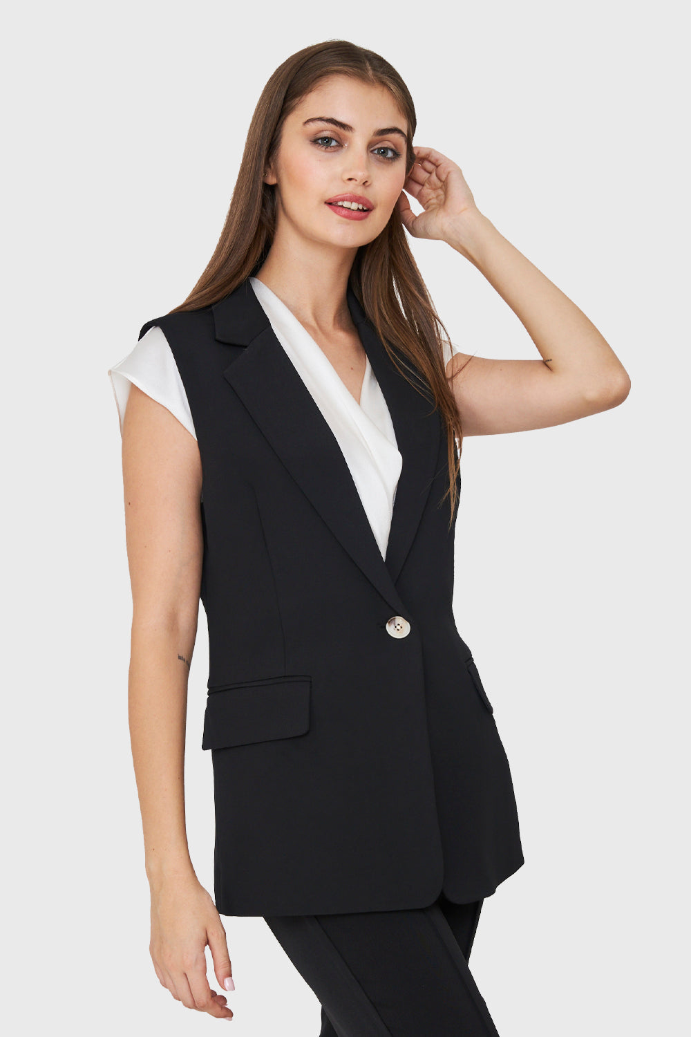 Características: Blazer sin mangas con botón de ajuste frontal. Tajo en la parte posterior y bolsillos laterales funcionales con solapa. Forrado.
