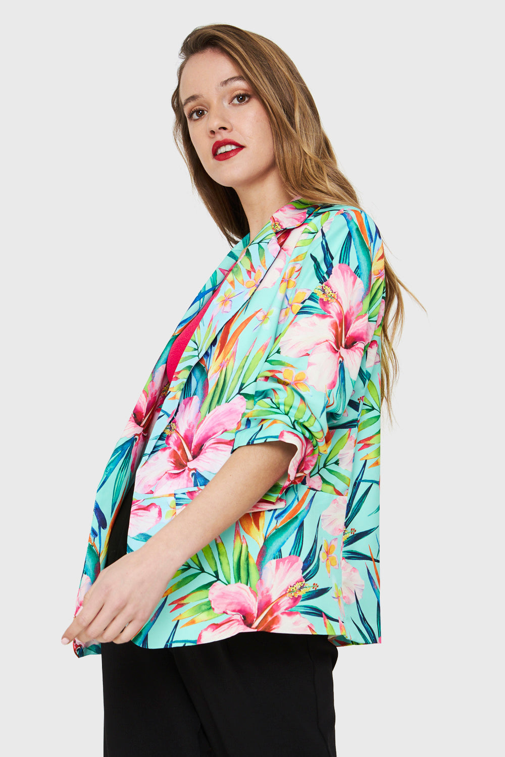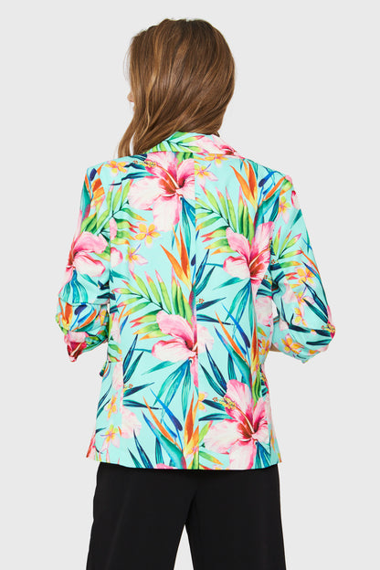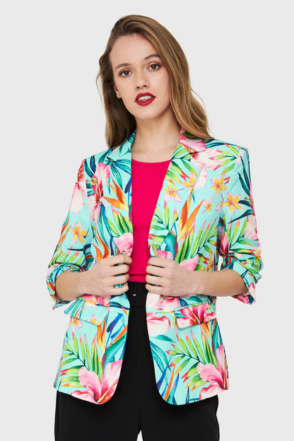 Características: Blazer de tope cuello en V print tropical. Mangas 3/4 recogidas. Bolsillos falsos. Posee forro y hombreras.