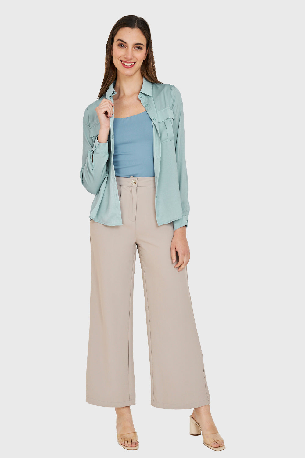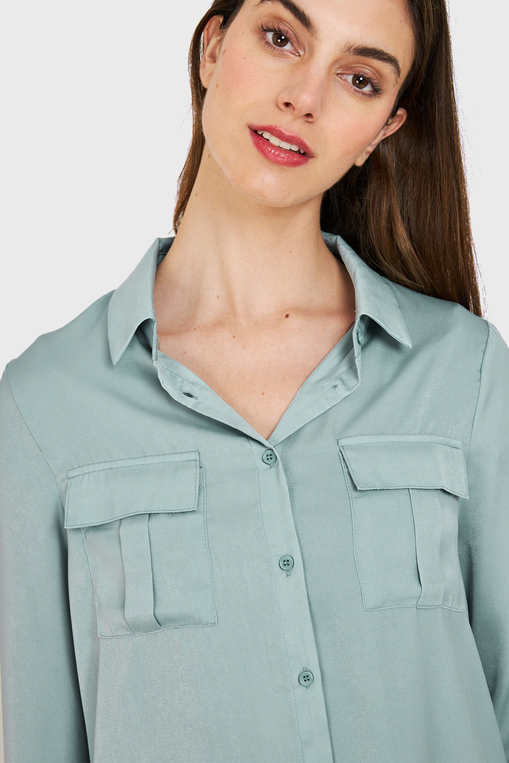 Características: Blusa tipo satín con botones delanteros y bolsillos frontales funcionales.