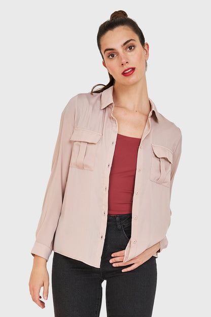 Blusa Bolsillos Tipo Satín Palo Rosa