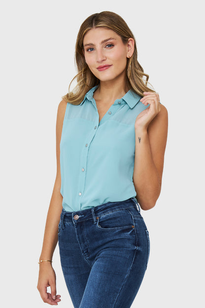 Características: Blusa estilo camisa sin manga. Botones metálicos de ajuste en la parte central del frente. Posee forro. Semi transparente sobre el busto.