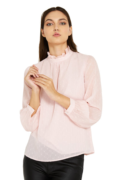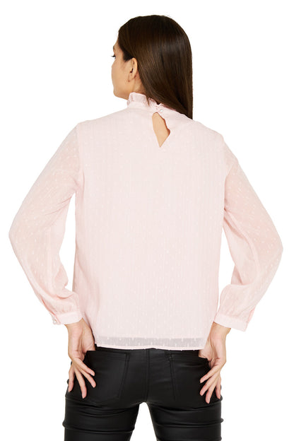 Características: Blusa con detalles de brillos. Manga larga. Cuello alto. Posee botón de ajuste en espalda y puños.