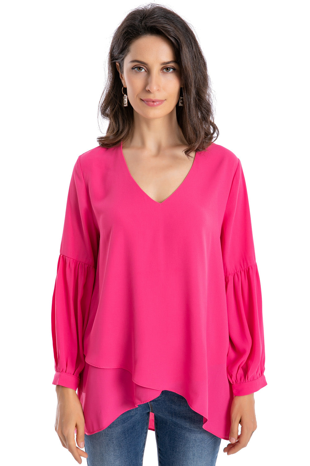 Características: Blusa asimétrica con capas y escote V. Manga larga semi globo.