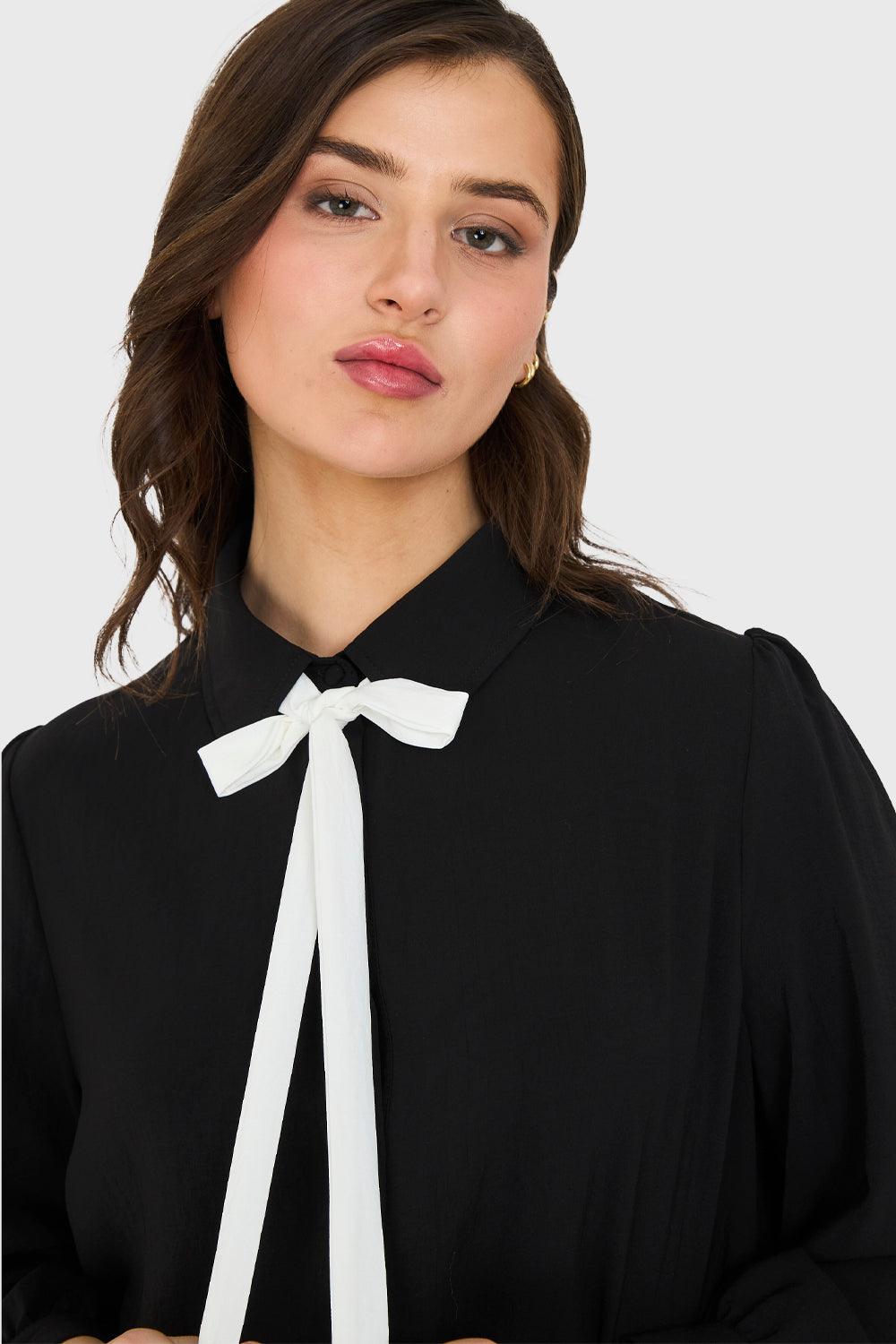 Características: Blusa manga larga tipo globo con botones forrados de ajuste. Lazo desmontable en cuello. Posee botones en el puño.