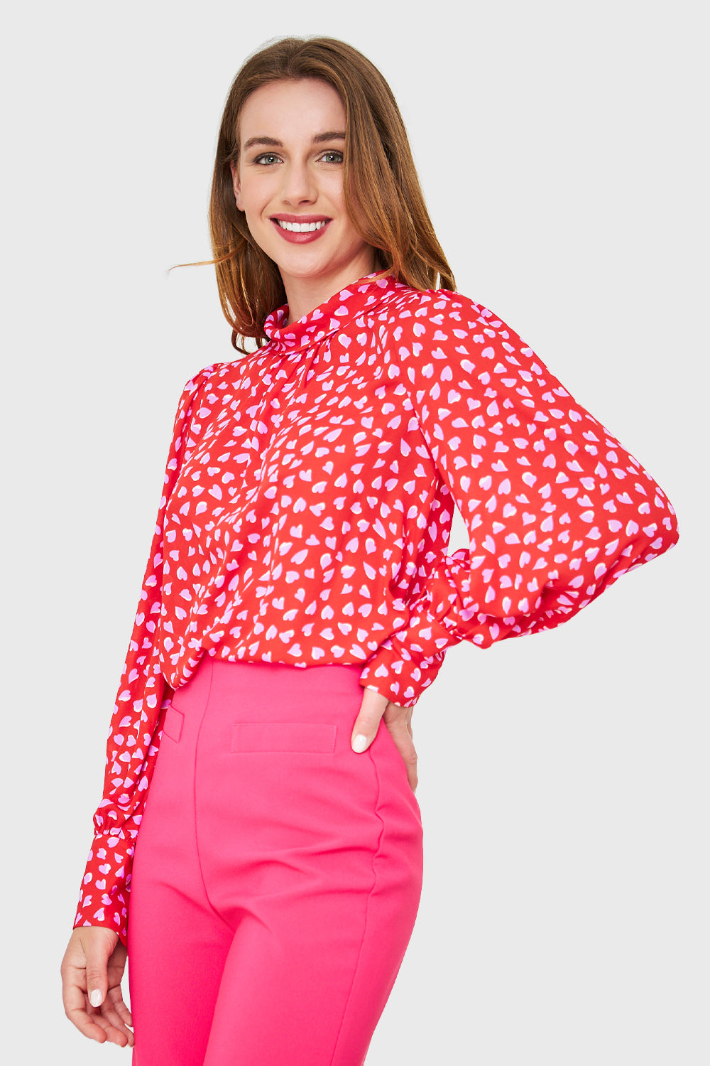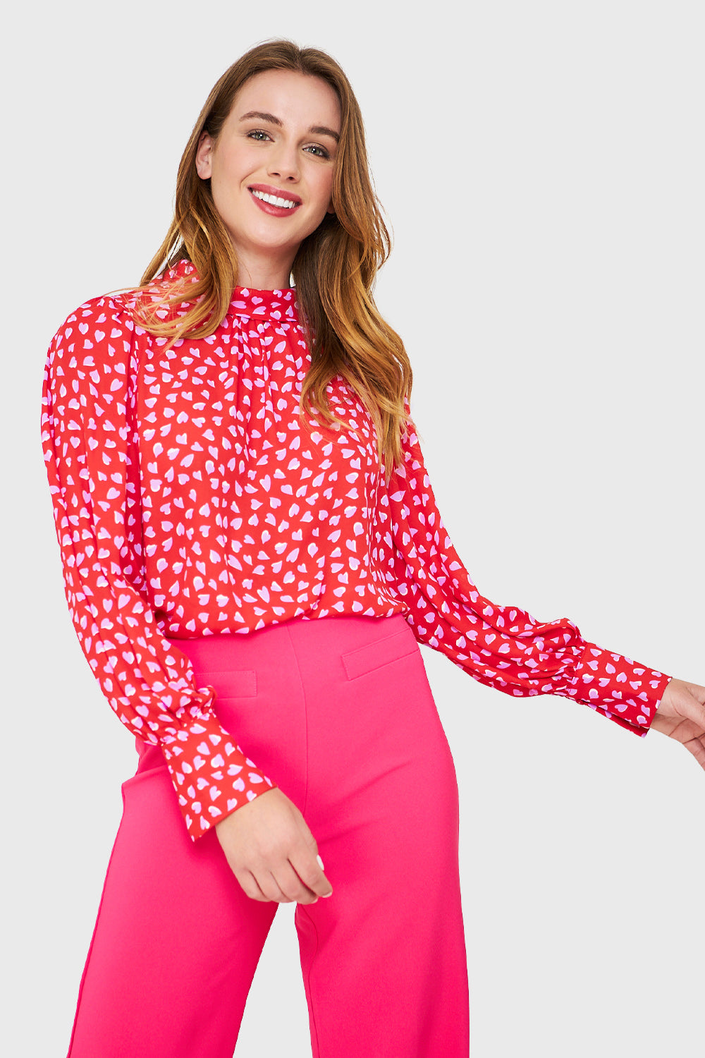 Características: Blusa con estampado de corazones. Manga larga con detalle recogido en hombros. Botones en puños. Pequeña abertura en la espalda con botones para cerrar el cuello.