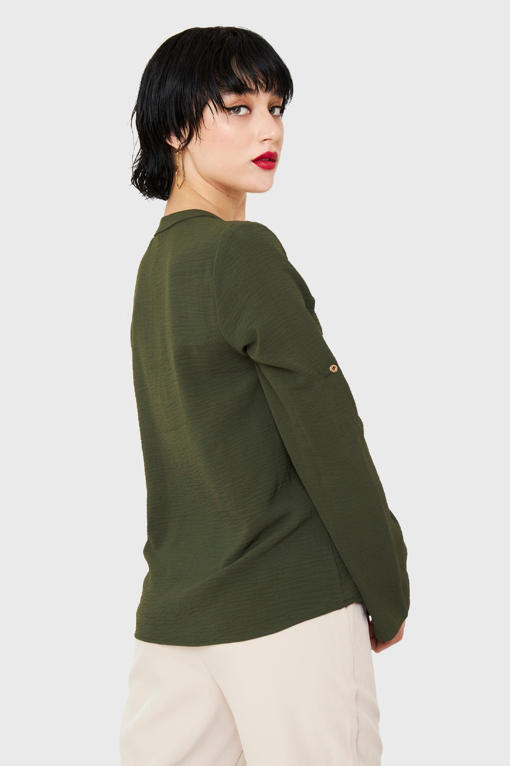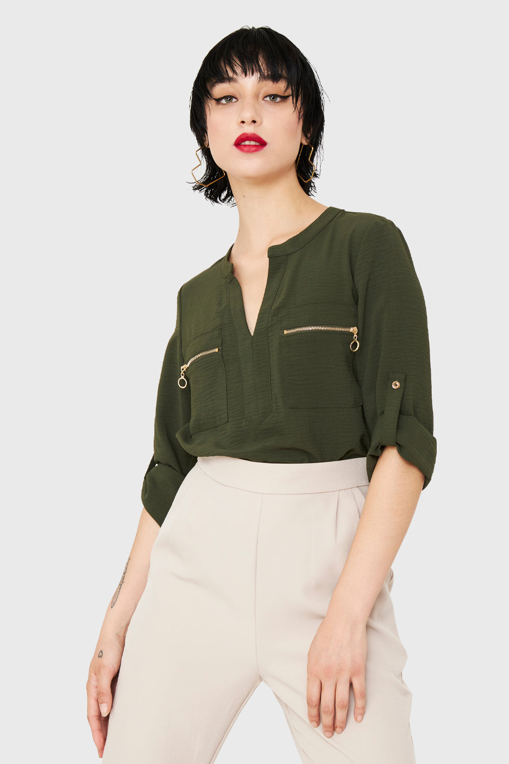 Características: Blusa cuello mao y escote en V, manga larga con botón de ajuste, y bolsillos en la parte frontal con cierres dorados.