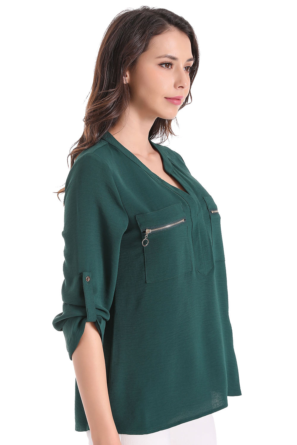 Características: Blusa cuello mao y escote en V, manga larga con botón de ajuste, y bolsillos en la parte frontal con cierres dorados.