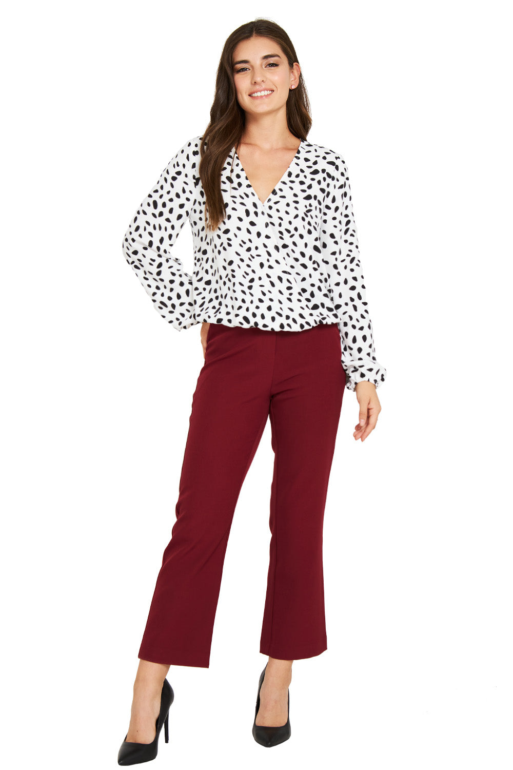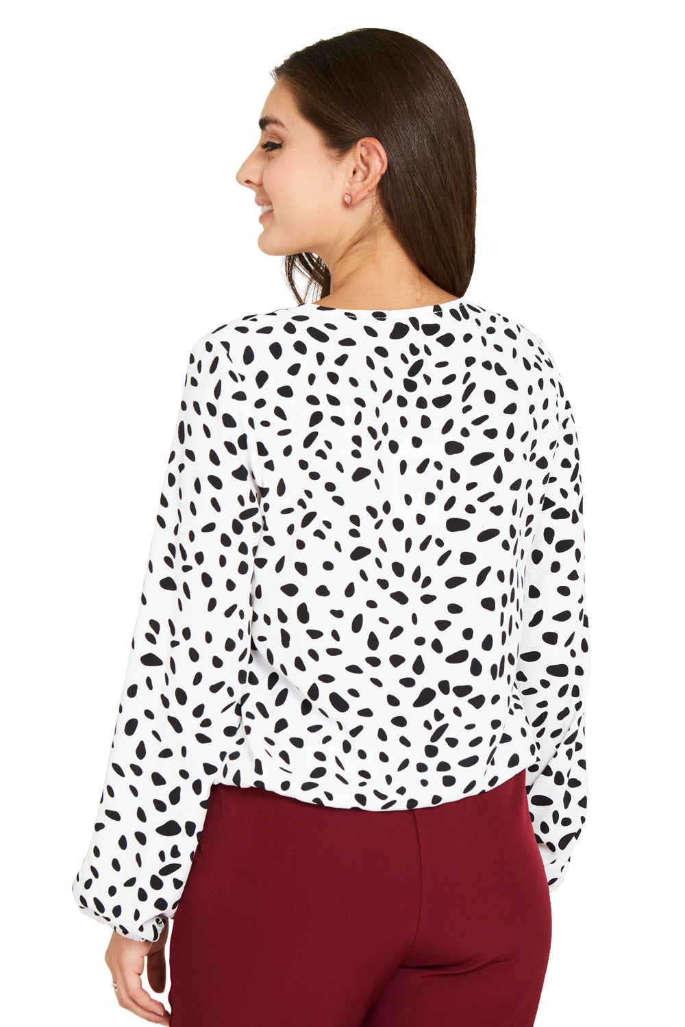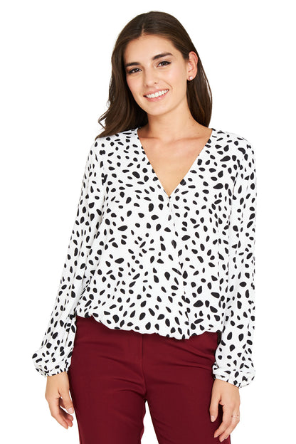 Características: Blusa print lunares irregulares tipo dalmata. Cuello V cruzado con pretina en la parte baja y puños.