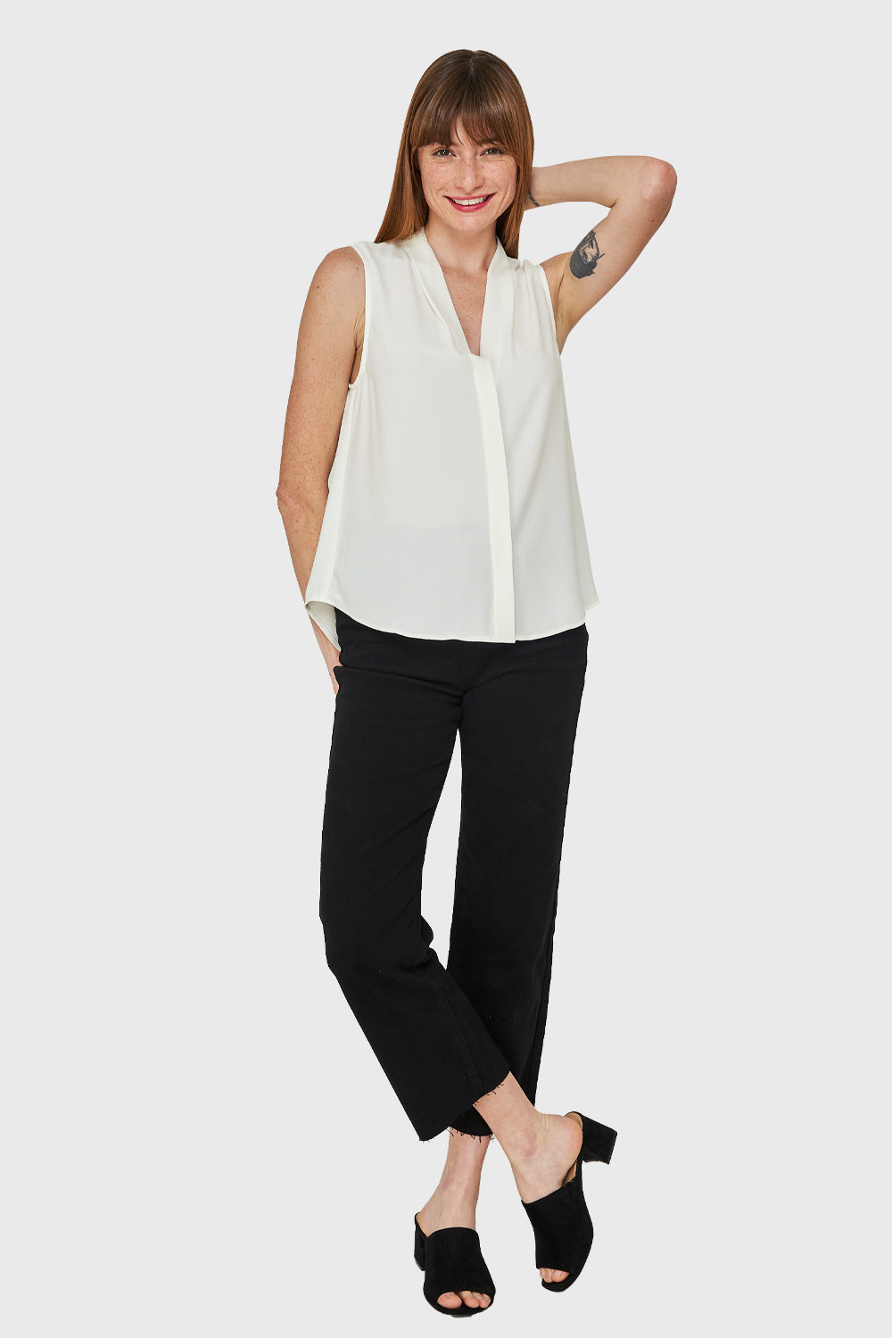 Características: Blusa básica con escote V sin mangas y pinzas frontales.