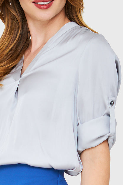Características: Blusa con mangas ajustables tipo satín. Posee un botón con el que se puede regular el largo de la manga. Escote V.