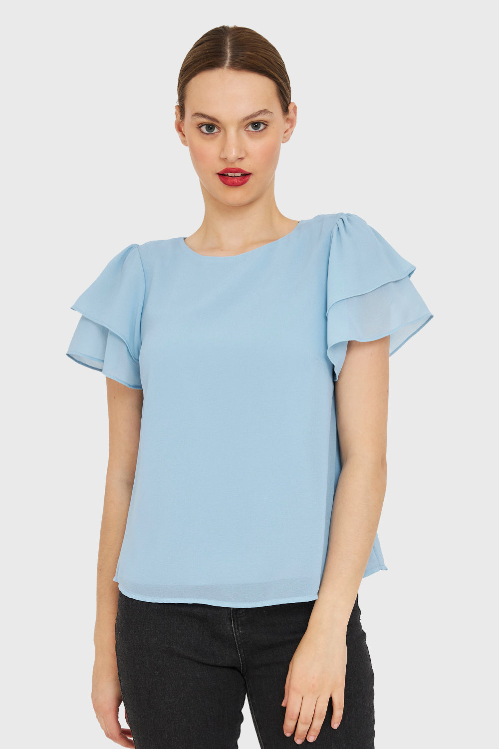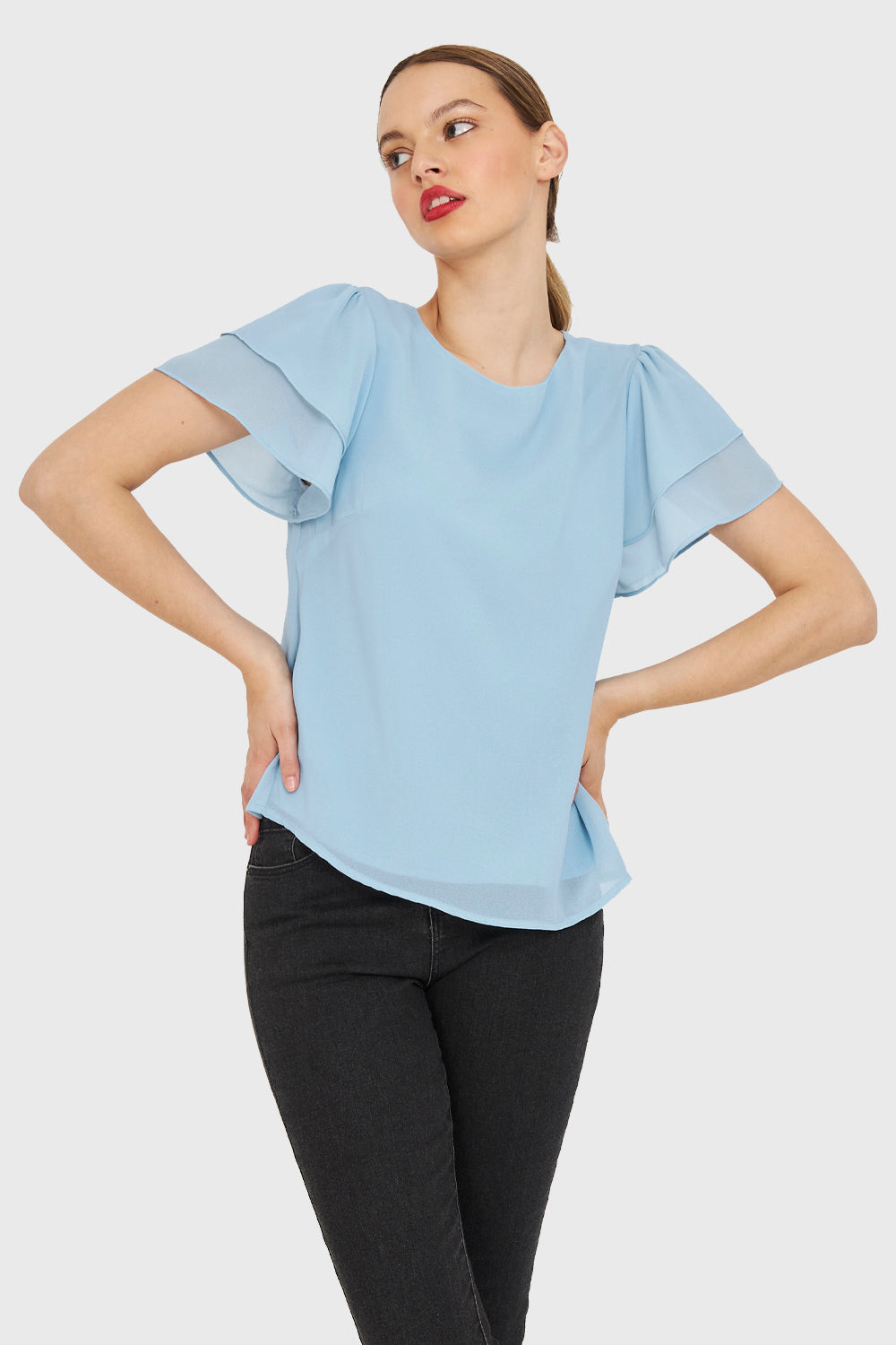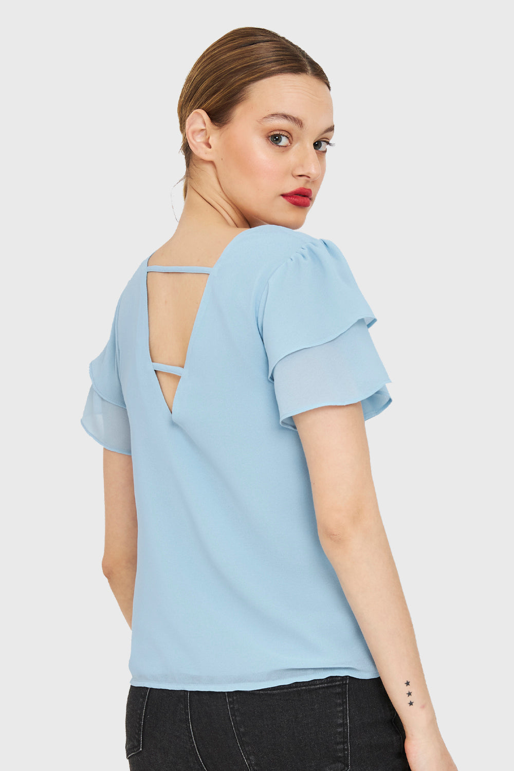 Características: Blusa básica cuello redondo forrada. Mangas con vuelos y espalda escote V con detalle cut out.