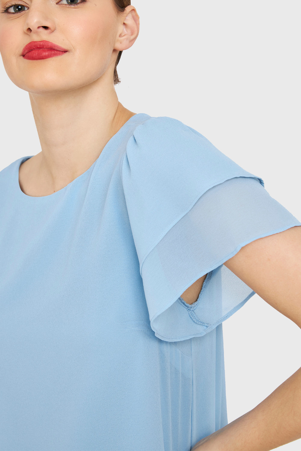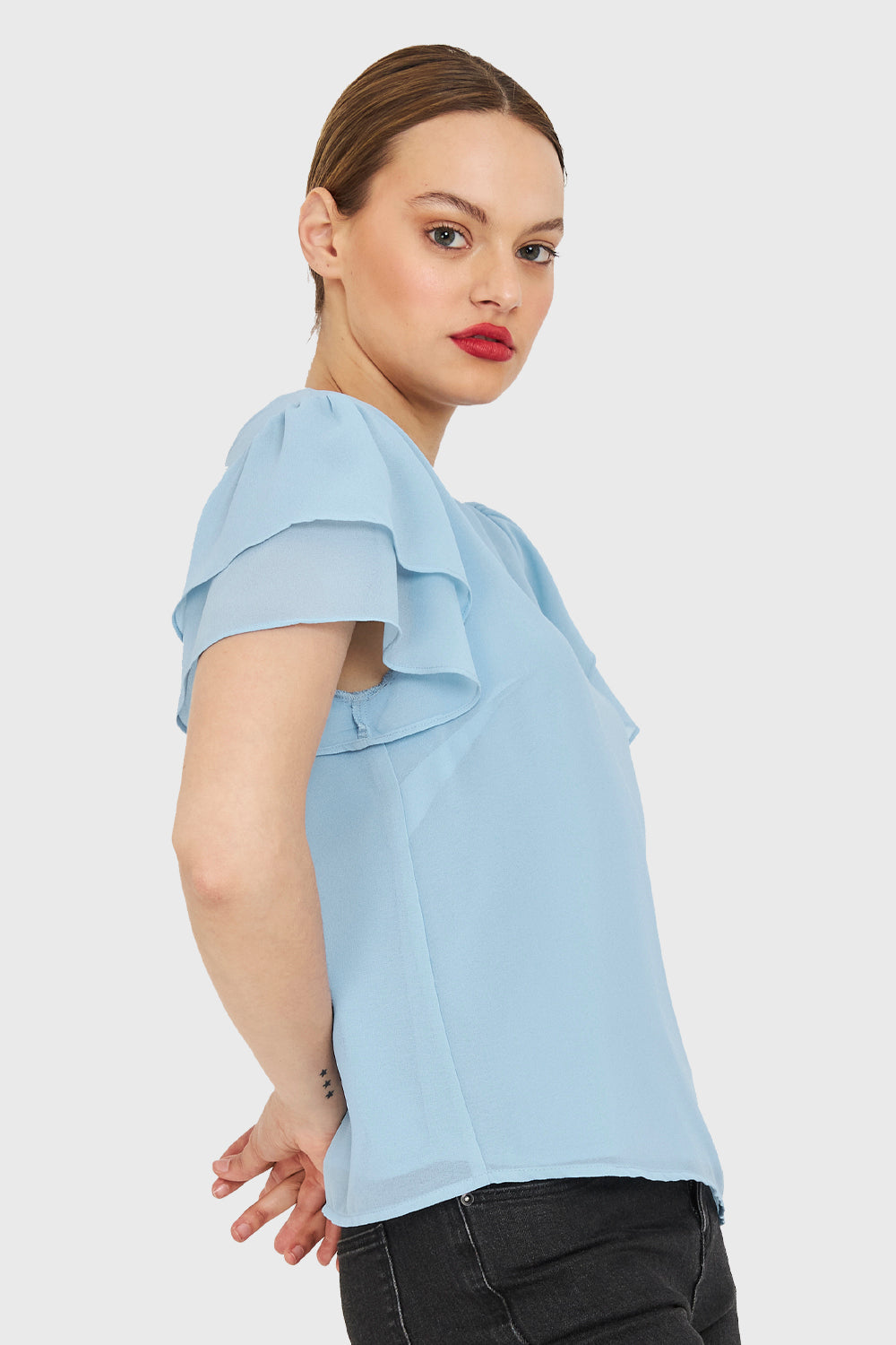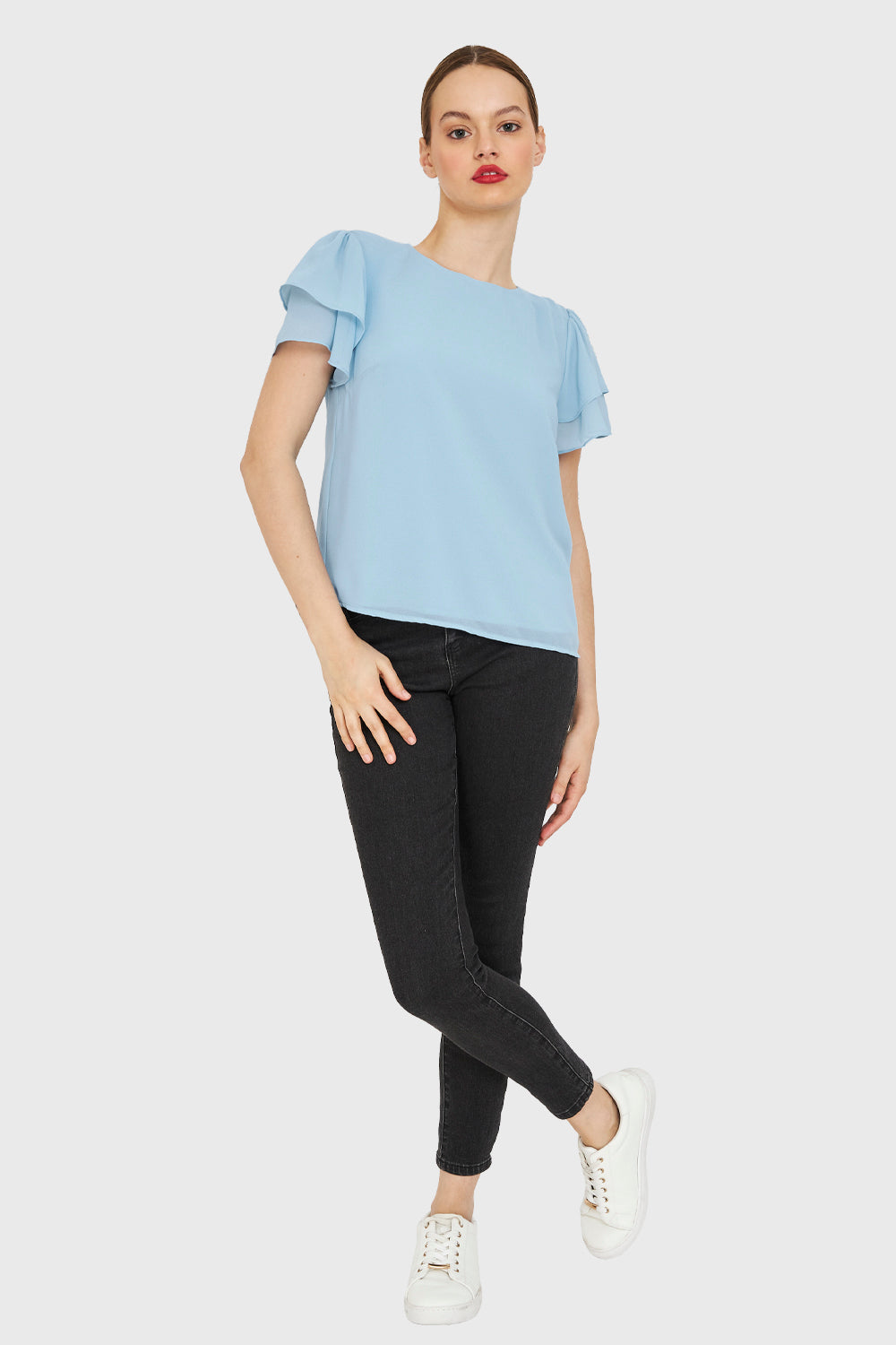 Características: Blusa básica cuello redondo forrada. Mangas con vuelos y espalda escote V con detalle cut out.