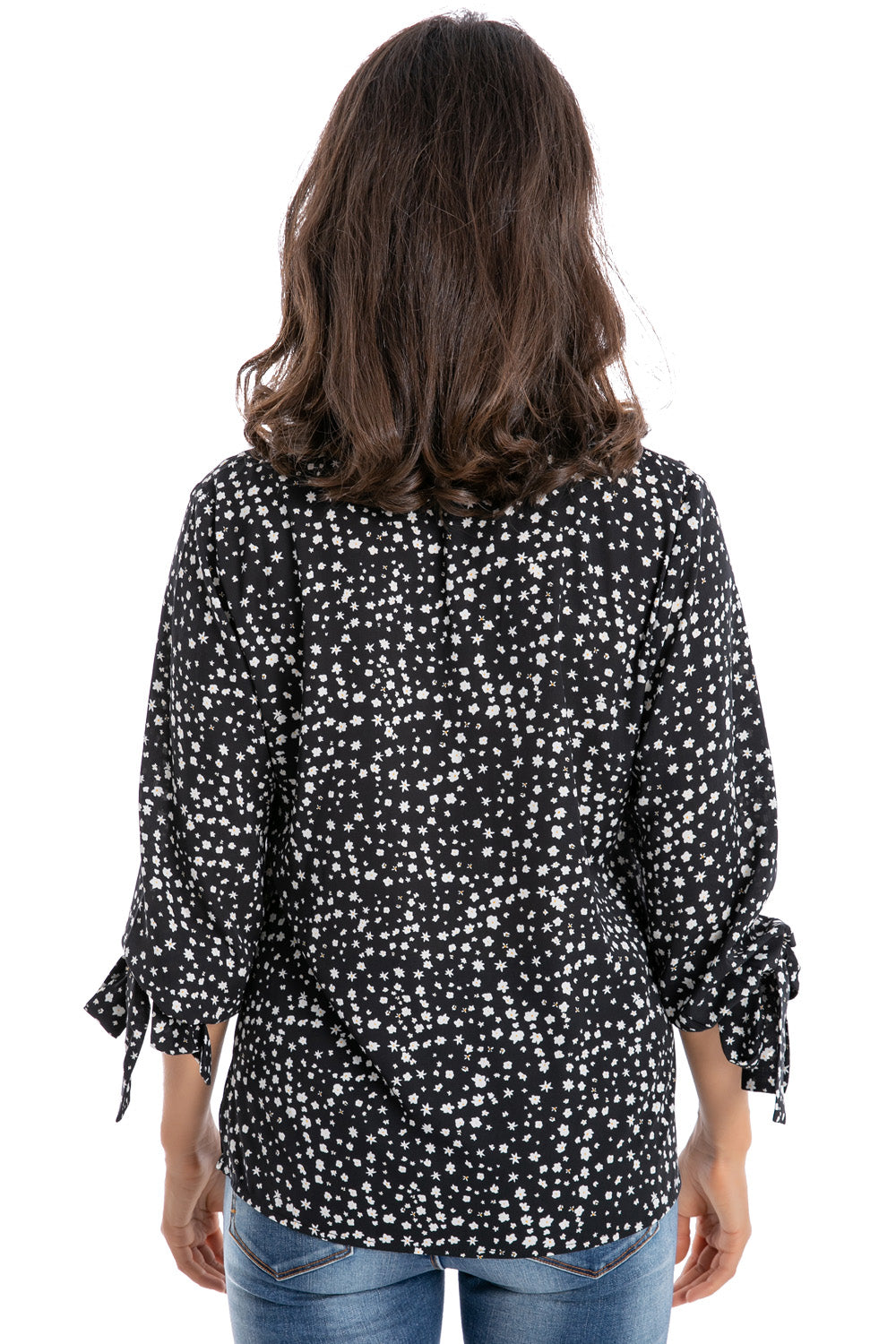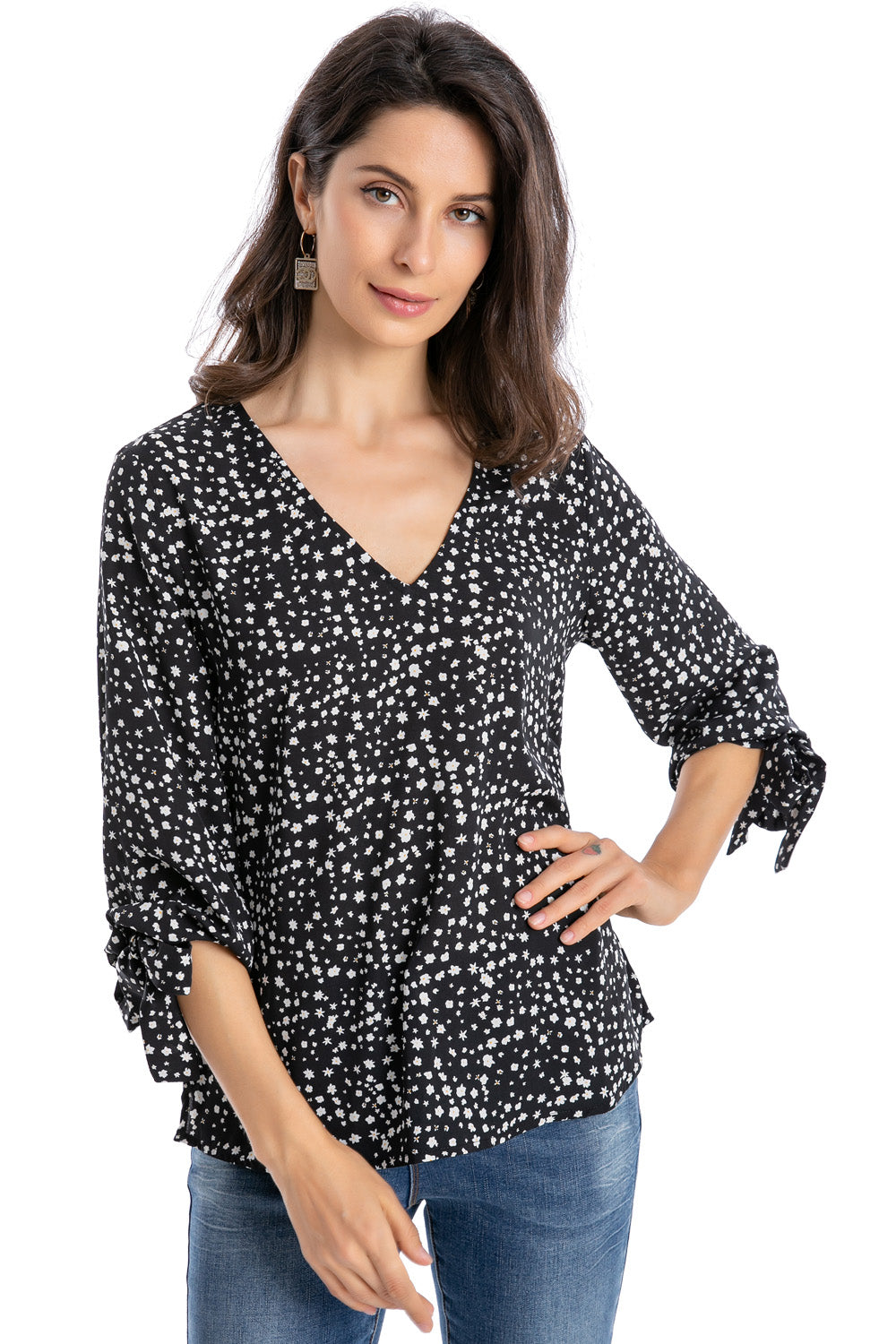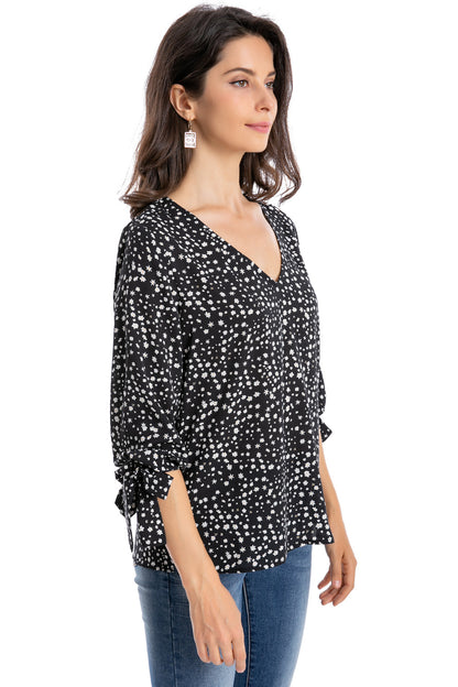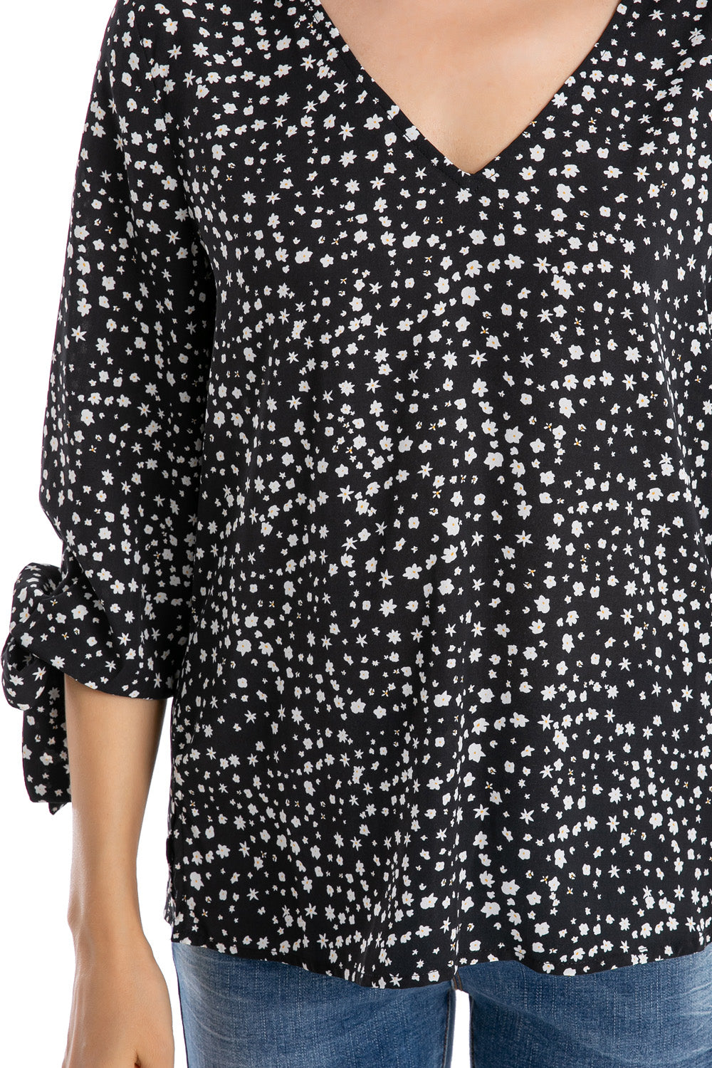 Características: Blusa mini flores, escote V y manga 3/4 con lazos de ajustes.