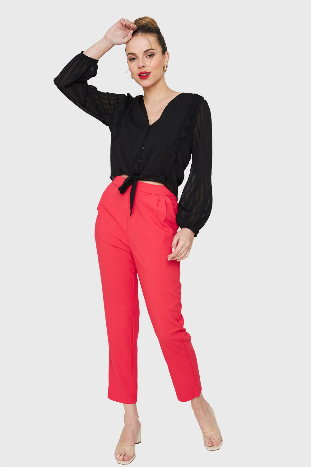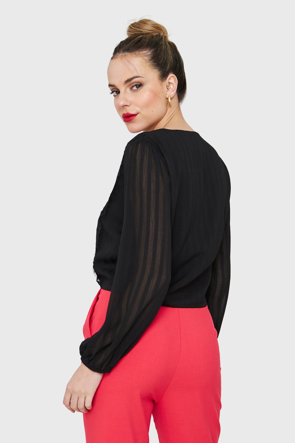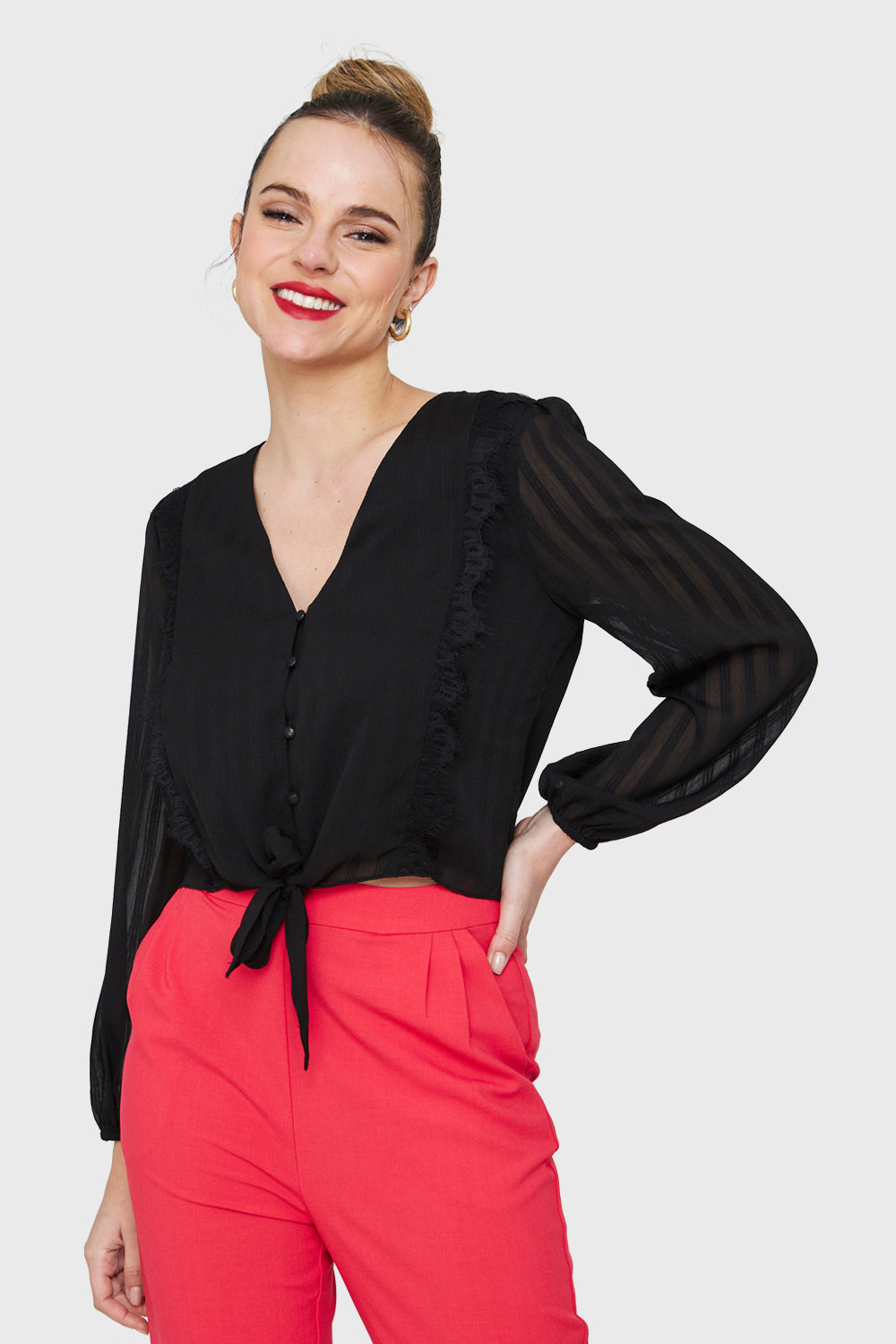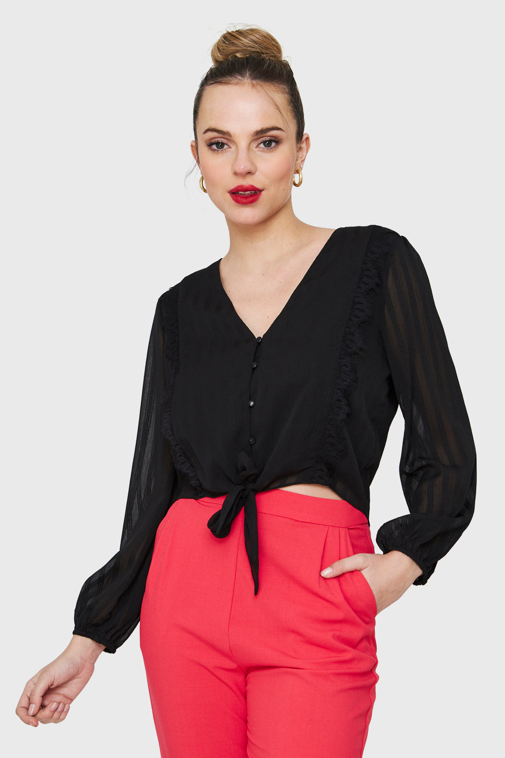 Características: Blusa manga larga cuello V con botones funcionales. Posee lazos para nudo y detalle de encaje en la parte frontal. Manga ancha transparente con puño elasticado. Posee forro en la parte frontal y espalda.