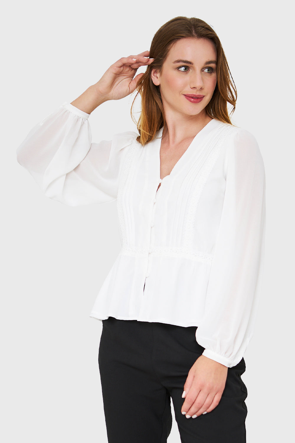 Características: Blusa peplum manga larga con escote en V, botones funcionales. Pliegues y cinta decorativa en la parte frontal y cintura. Botón de ajuste en puños. Posee forro.