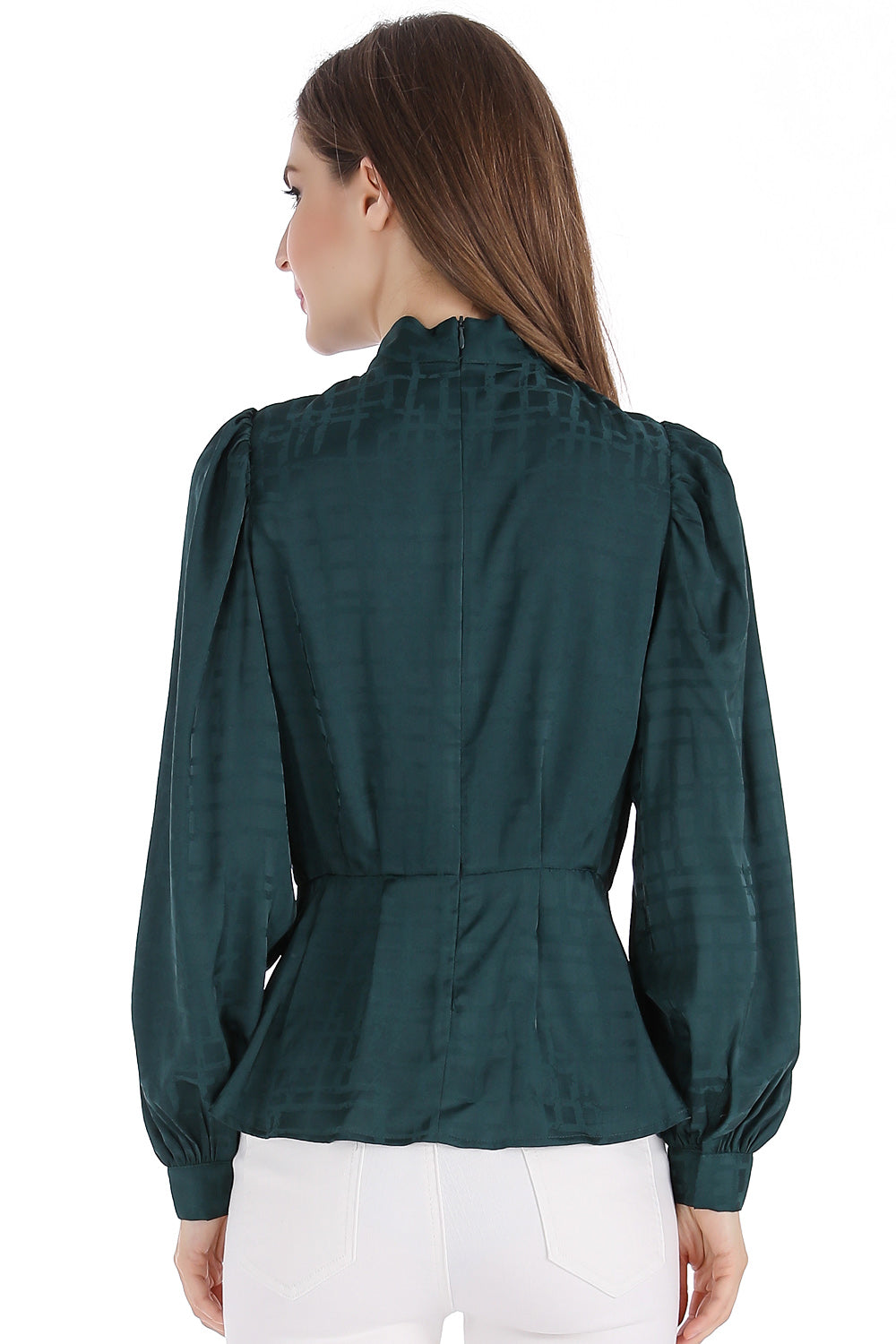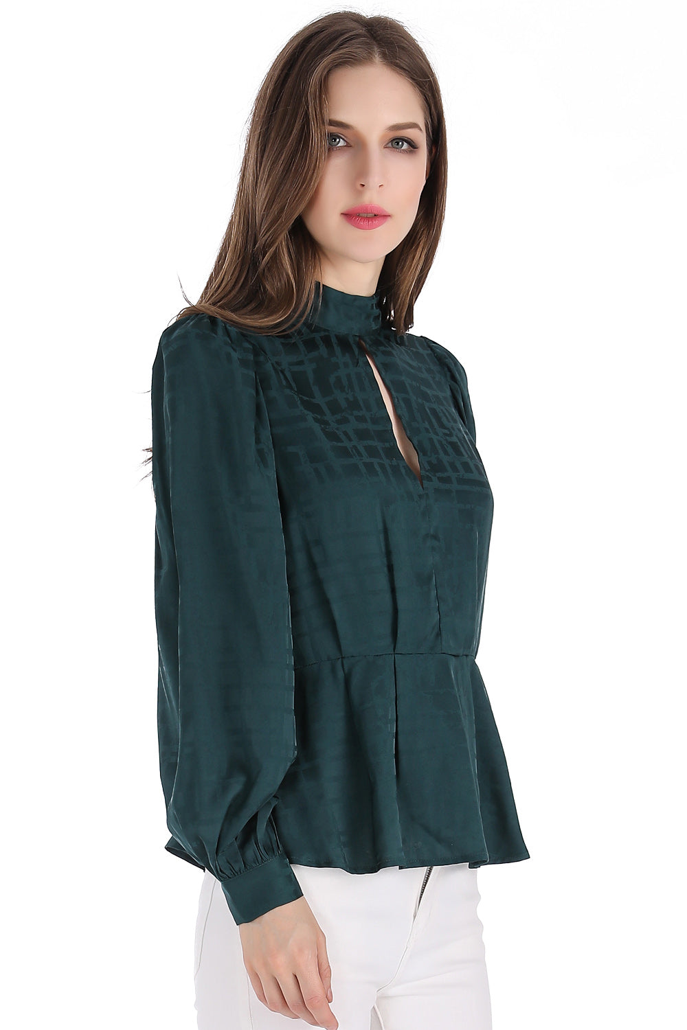 Características: Blusa peplum cuello choker con print geométrico tipo seda. Escote pez frontal y cierre en espalda. Puño en manga que da un efecto aglobado.