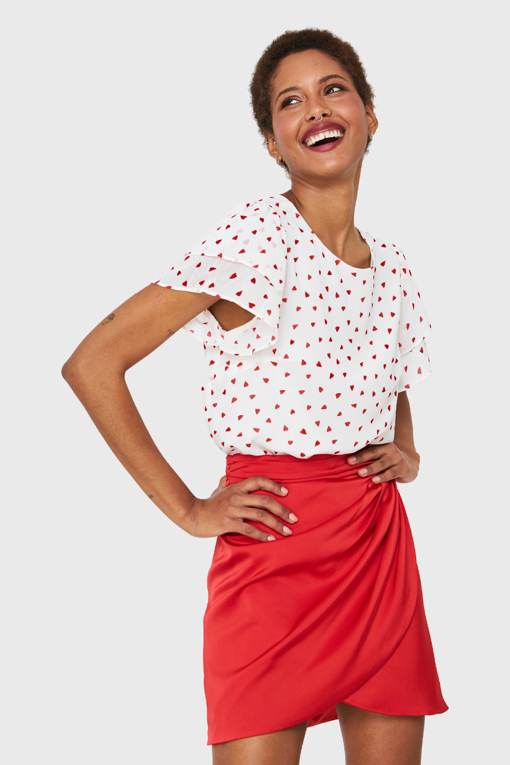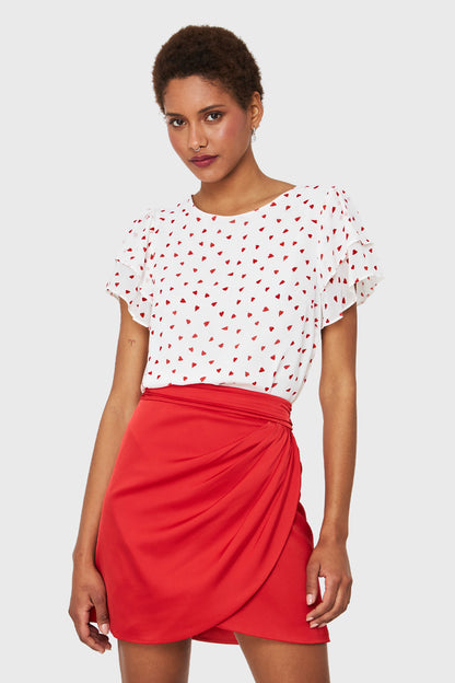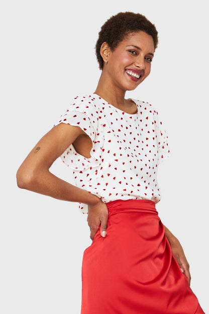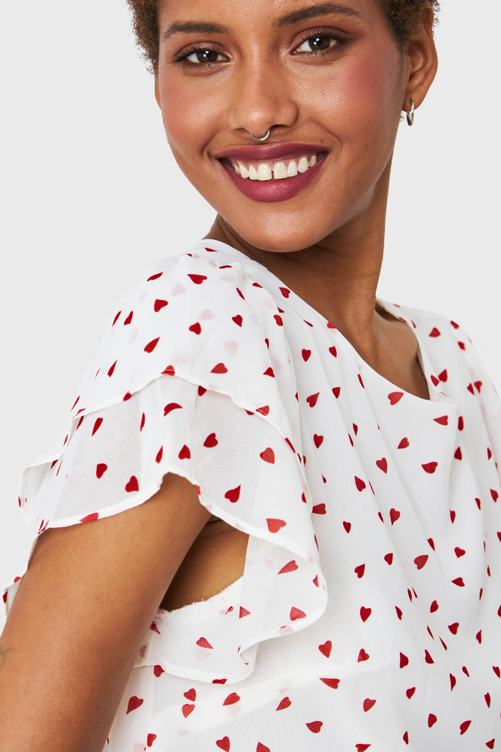 Características: Blusa básica cuello bote. Estampado de corazones. Mangas con vuelos y espalda escote en V con lazos. Posee forro.