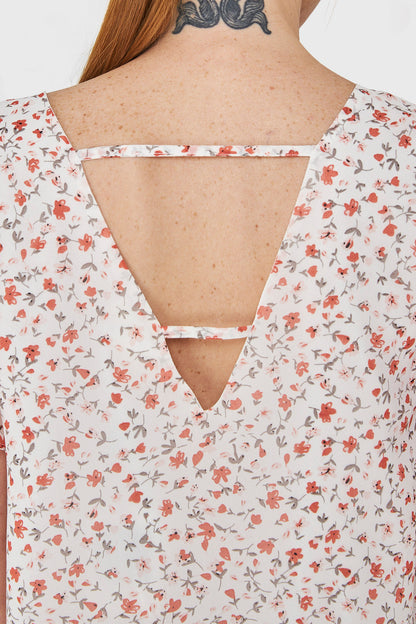 Características: Blusa básica cuello bote. Estampado floral. Mangas con vuelos y espalda escote en V con lazos. Posee forro.