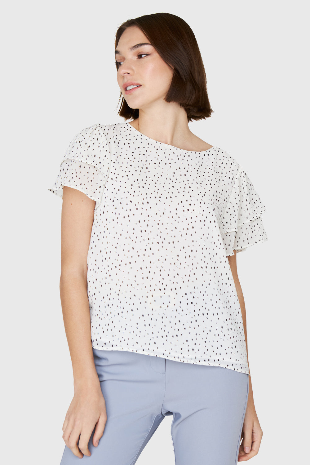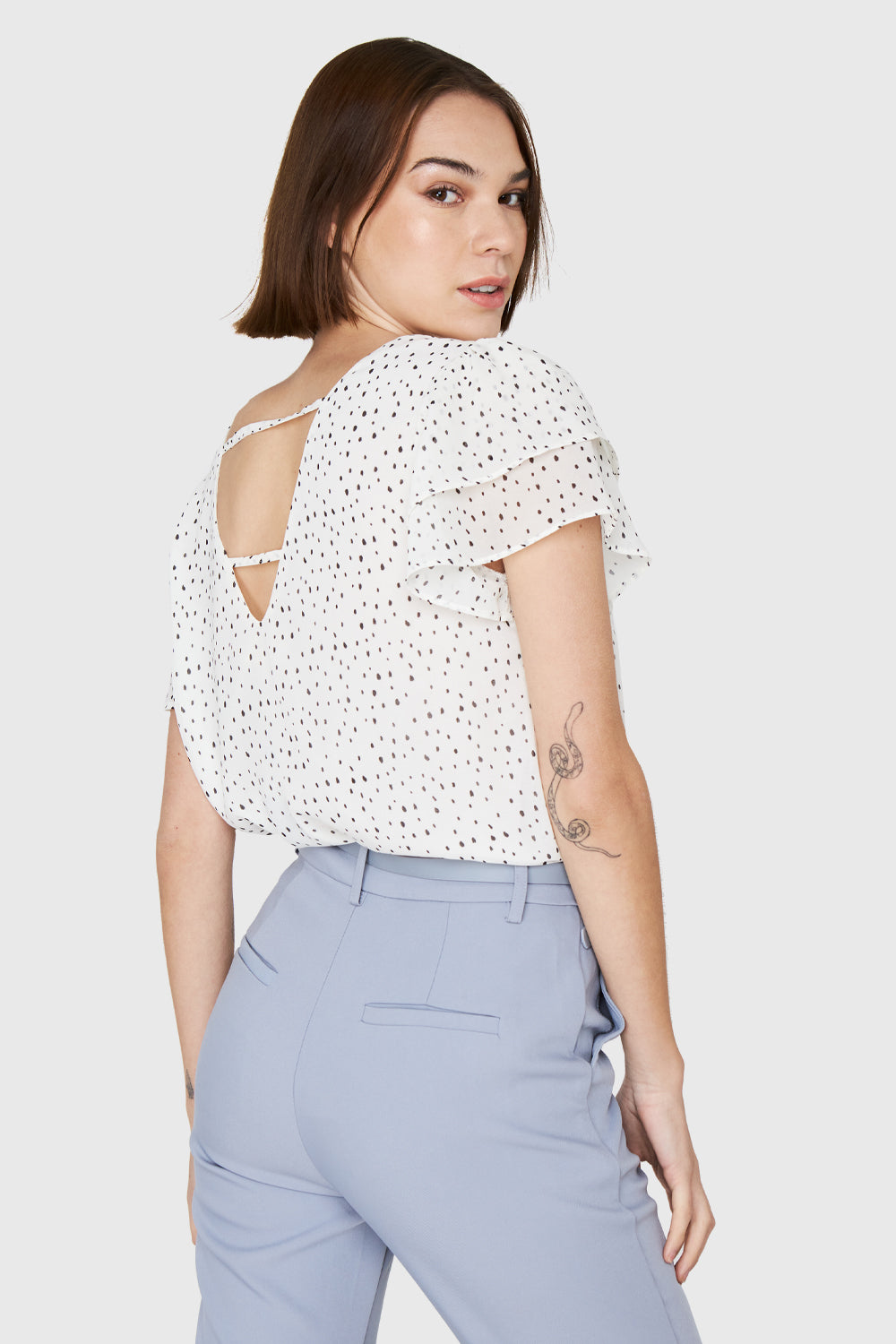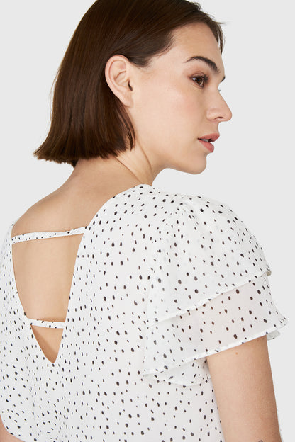 Características: Blusa básica cuello bote. Estampado de puntitos. Mangas con vuelos y espalda escote en V con lazos. Posee forro.