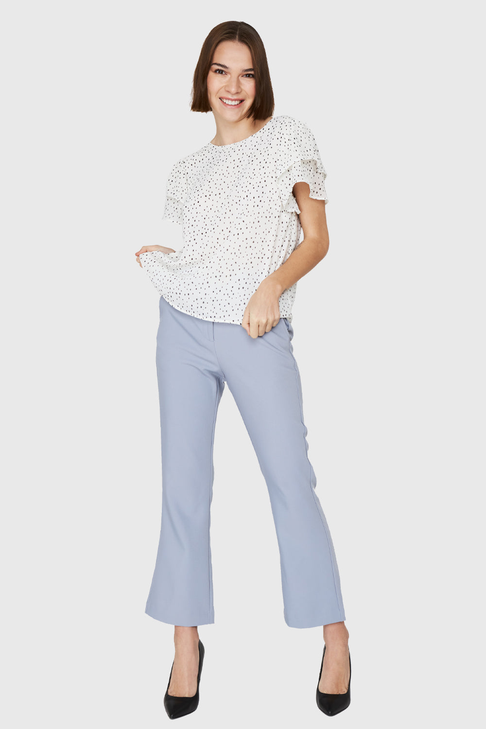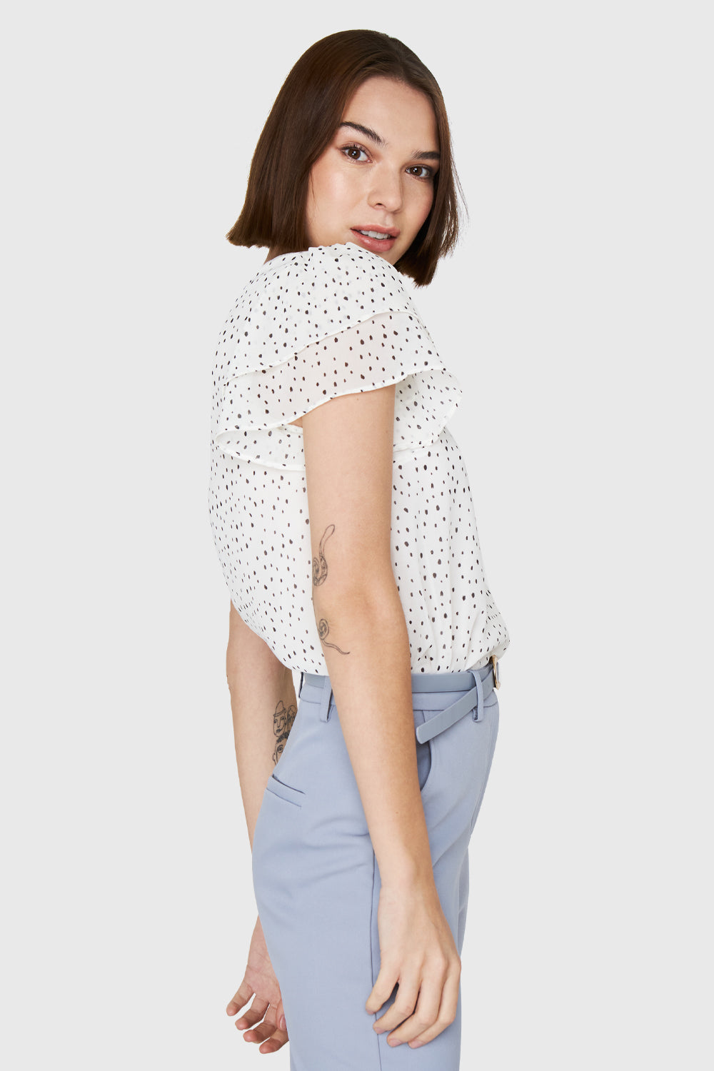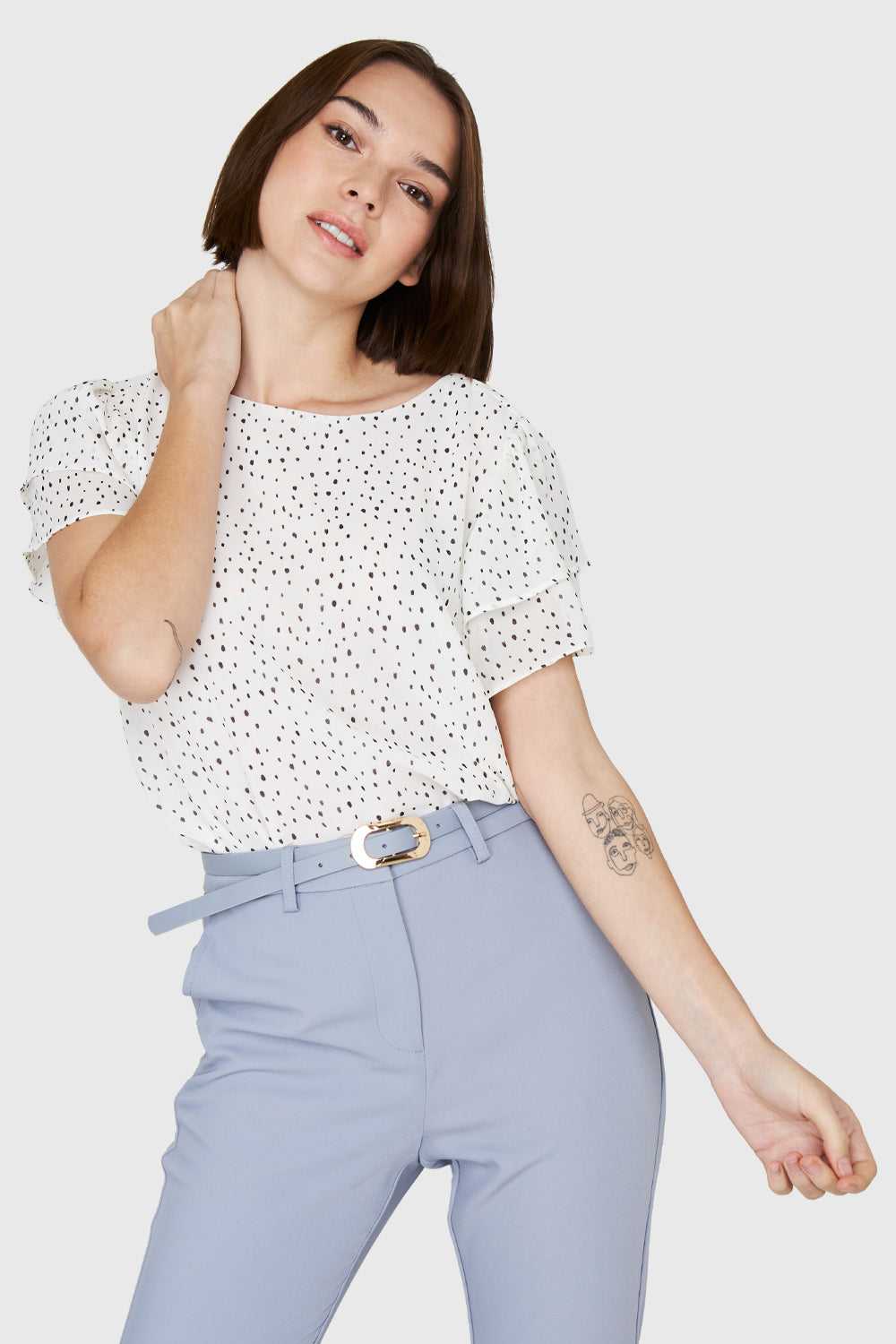 Características: Blusa básica cuello bote. Estampado de puntitos. Mangas con vuelos y espalda escote en V con lazos. Posee forro.