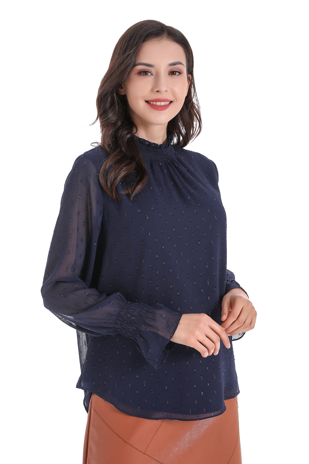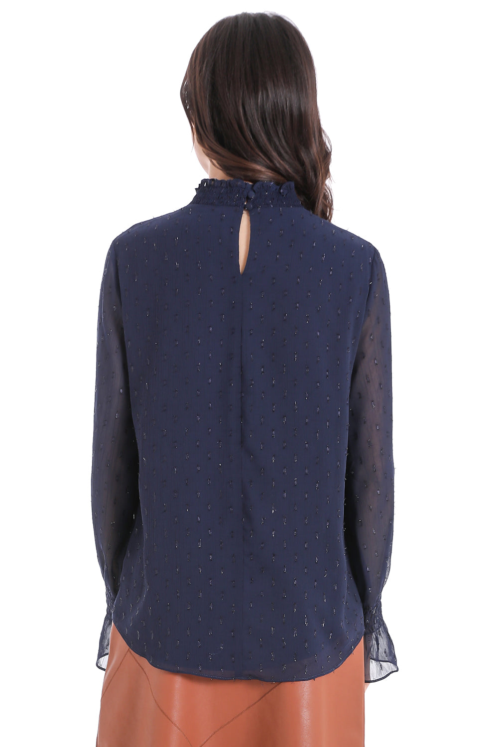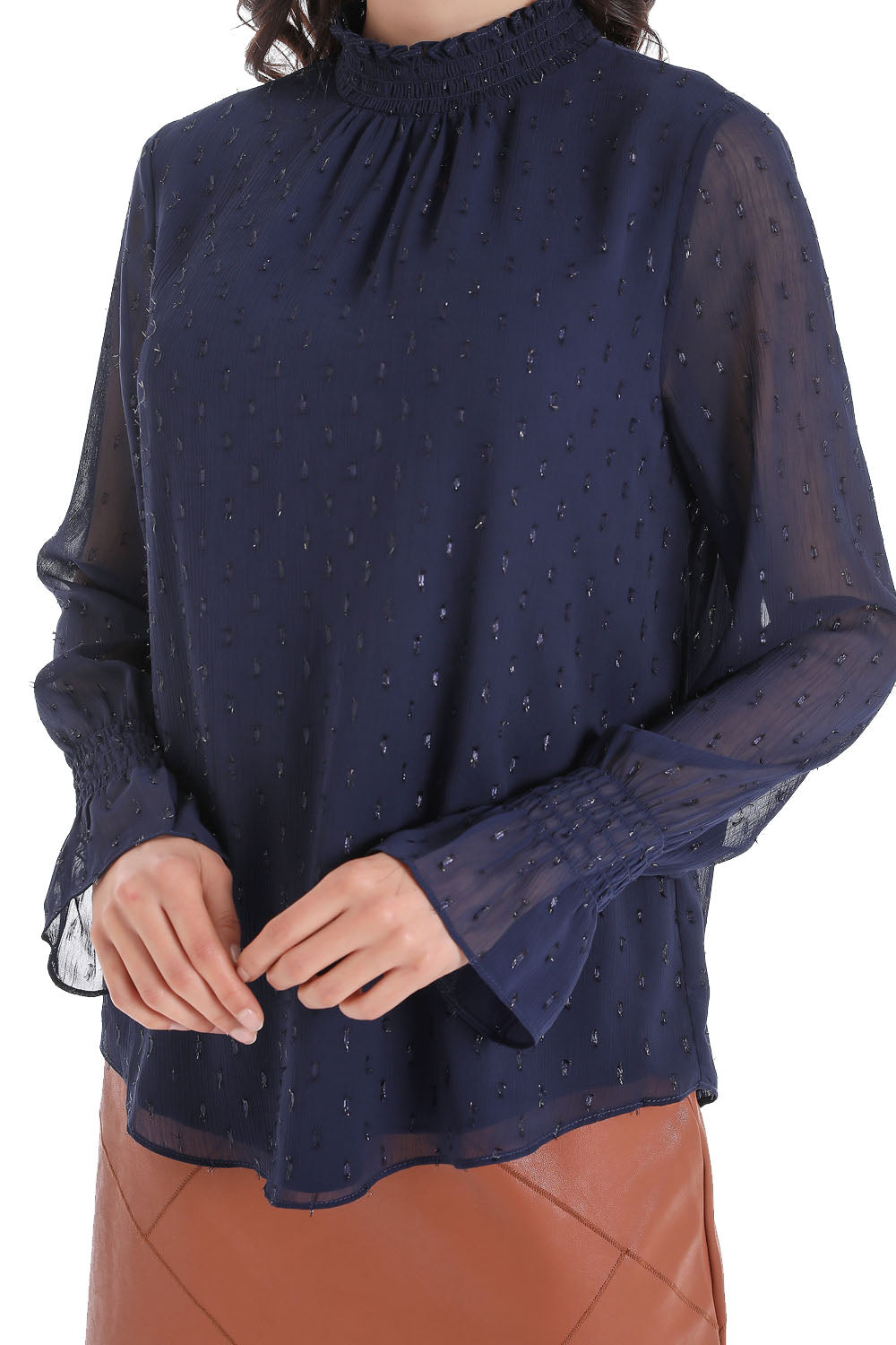 Características: Blusa puntos cuello alto plisado con elastico y dos botones en espalda. Mangas largas semi transparente con detalle de mini vuelitos en puños y elástico. Posee forro.