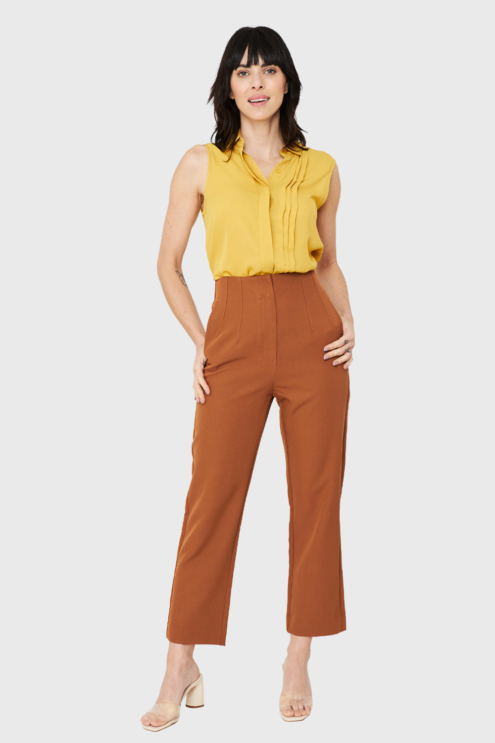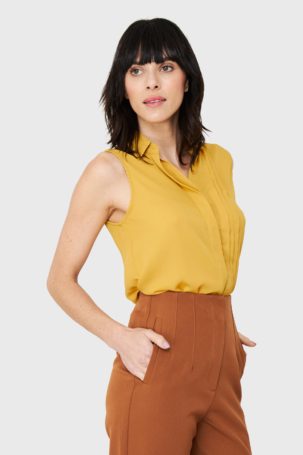 Características: Blusa sin mangas con cuello camisero. Botones de ajustes y botonero invisible. Pliegues decorativos en la parte frontal. No posee forro.