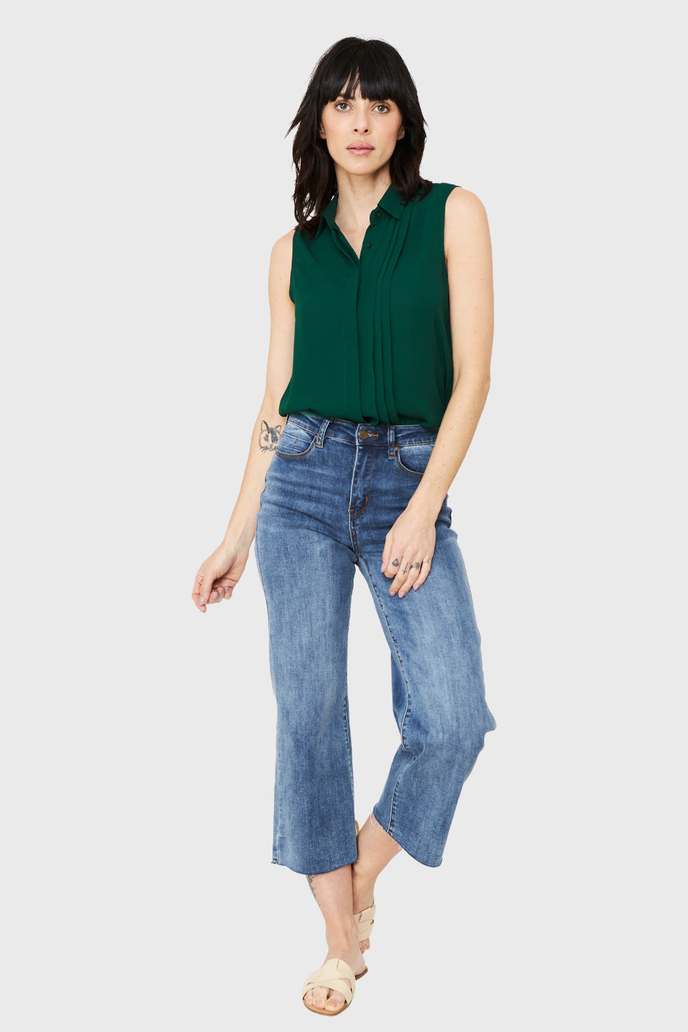 Características: Blusa sin mangas con cuello camisero. Botones de ajustes y botonero invisible. Pliegues decorativos en la parte frontal. No posee forro.