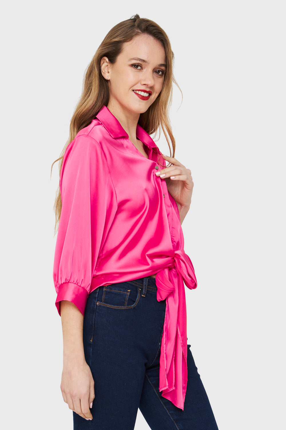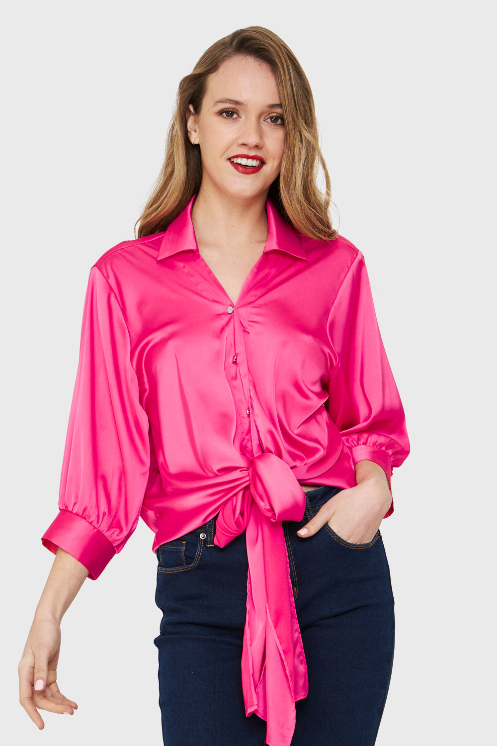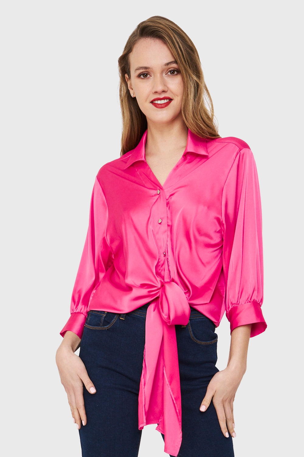 Características: Blusa manga 3/4 tipo satín con lazos para nudo y botones frontales.