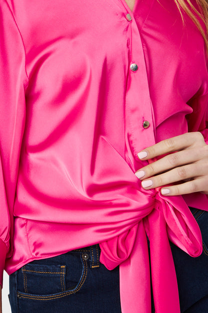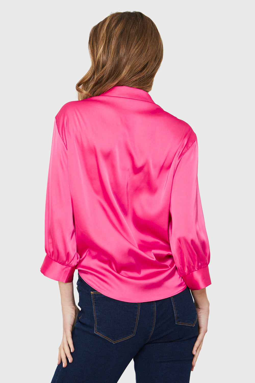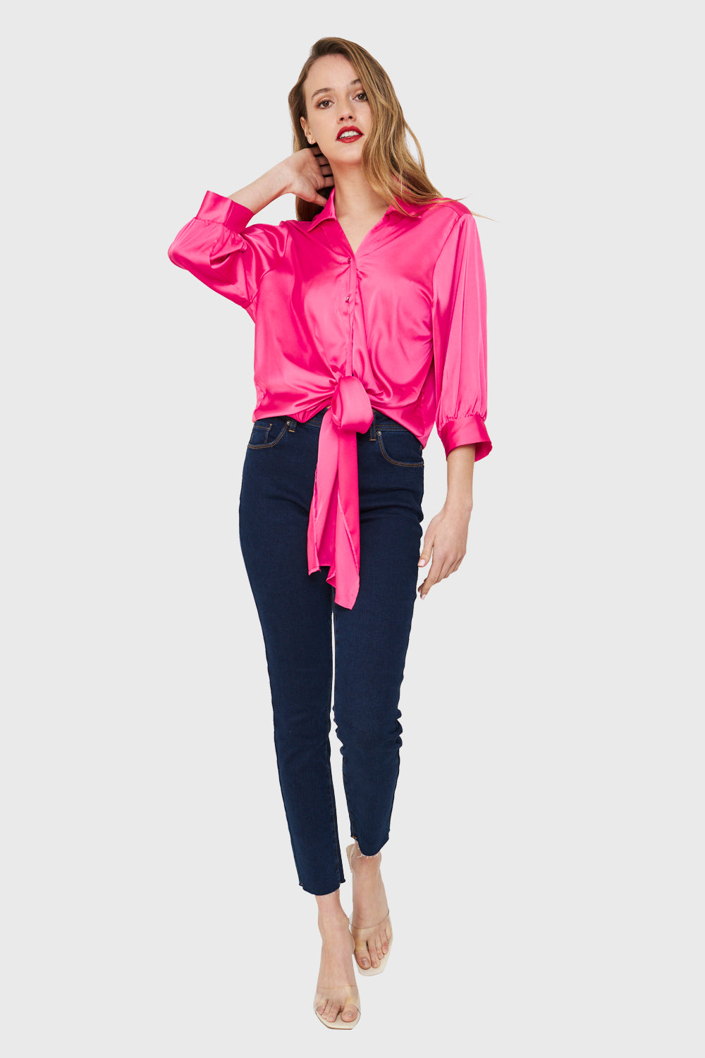 Características: Blusa manga 3/4 tipo satín con lazos para nudo y botones frontales.